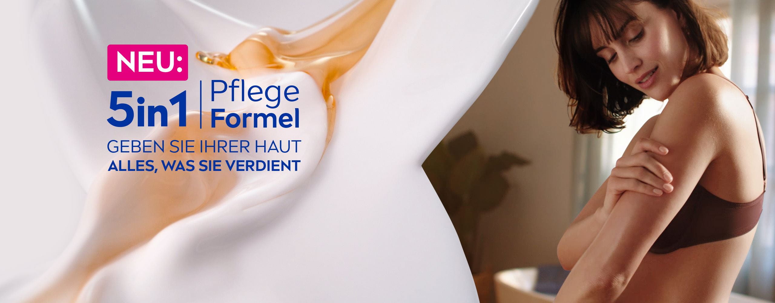 Unsere nährenden und feuchtigkeitsspendenden Produkte geben Ihrer Haut alles, was sie verdient. Mit unseren neuen: 5in1 Pflege Formel und tiefenwirksamen Feuchtigkeitsformeln, für eine glatte und gesund aussehende Haut.