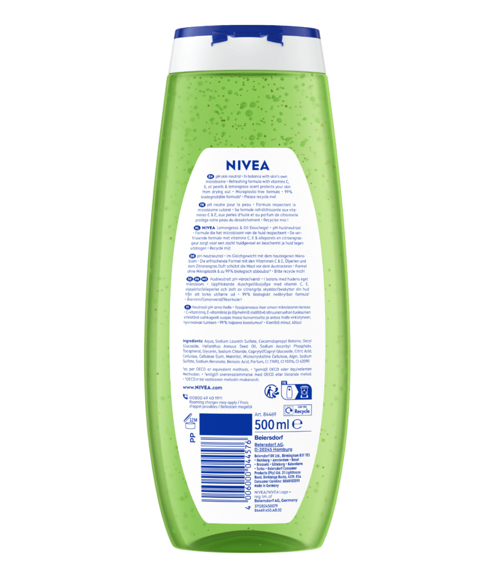 Das NIVEA Pflegedusche Lemongrass & Oil mit Pflegeöl-Perlen pflegt die Haut sanft. Geniesse den samtweichen Schaum und den revitalisierenden Zitronengras-Duft.