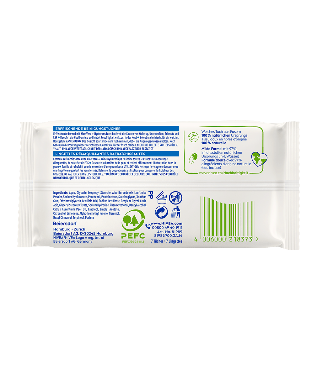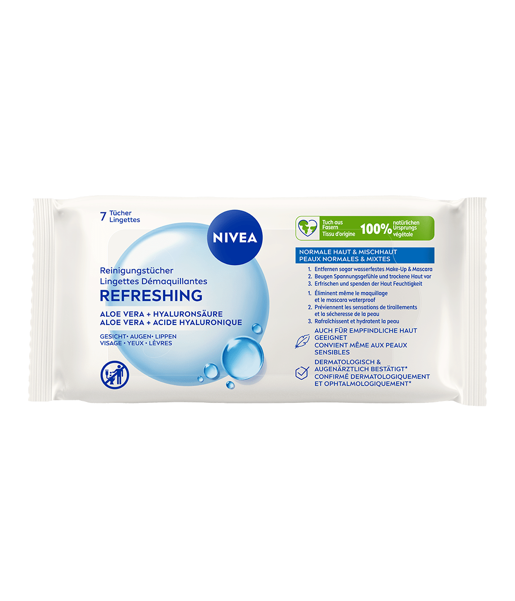 Die weichen Tücher reinigen die Haut gründlich und spenden Feuchtigkeit: NIVEA Erfrischende Reinigungstücher.
