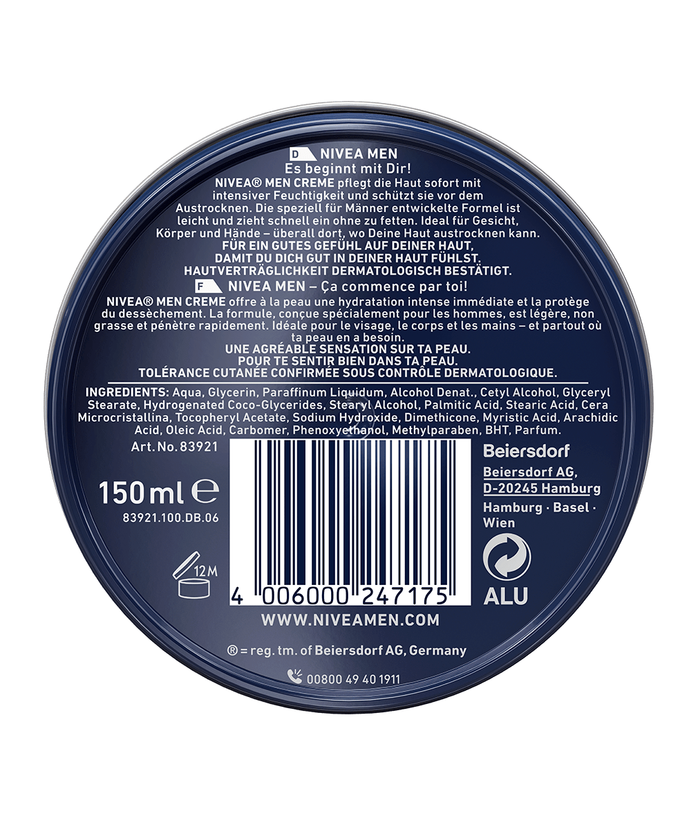Entdecke die NIVEA MEN CREME in der limitierten Edition Real Madrid! NIVEA® MEN CREME pflegt die Haut sofort mit intensiver Feuchtigkeit und schützt sie vor dem Austrocken. Die Feuchtigkeitscreme für Männer zieht schnell ein ohne zu fetten.