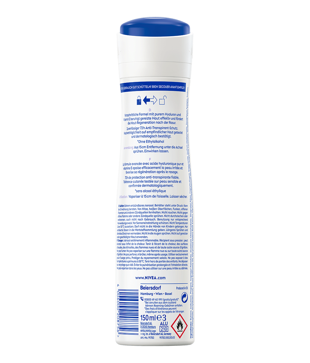 Enthalten: Butane, Isobutane, Propane, Isopropyl Palmitate, Aluminum Chlorohydrate, Dicaprylyl Ether, Caprylic/Capric Triglyceride, Sodium Hyaluronate, Tocopheryl Acetate, Sodium Ascorbyl Phosphate, Octyldodecanol, Persea Gratissima Oil, Glycyrrhiza Glabra Root Extract, Glycerin, Disteardimonium Hectorite, Propylene Carbonate, Tocopherol, Aqua, Parfum