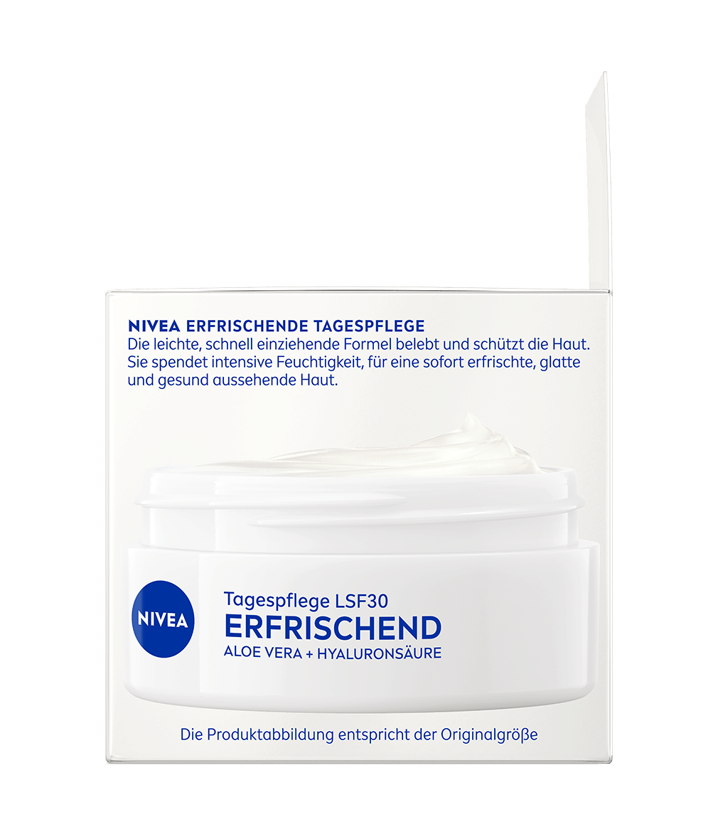 Die NIVEA Erfrischende Tagespflege mit Aloe Vera und Hyaluronsäure versorgt die Haut 24 Stunden lang mit Feuchtigkeit und schützt sie gleichzeitig vor äusseren Stressfaktoren