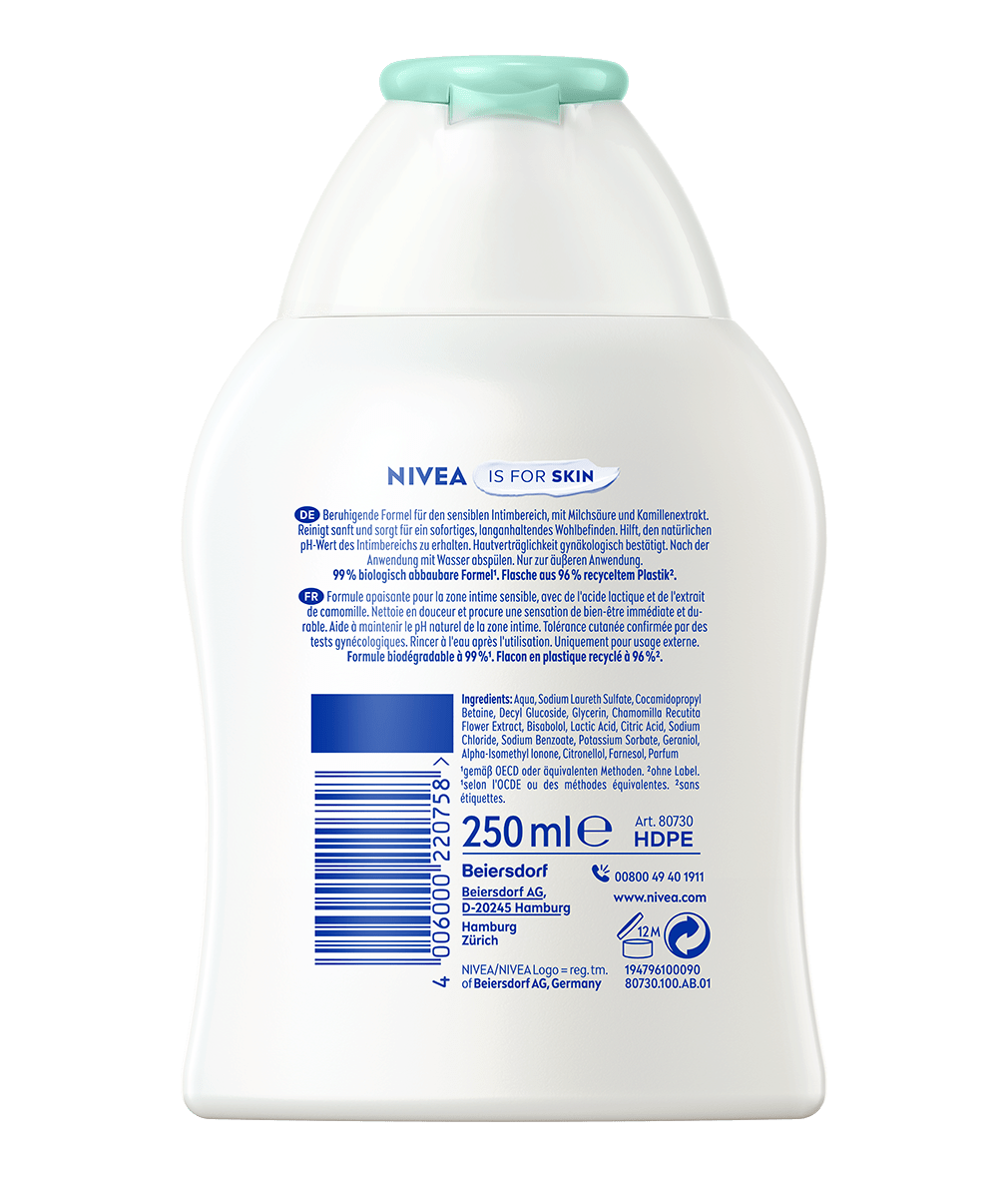 NIVEA Intimo Mild Fresh Waschlotion mit Bio Jojoba Öl und natürlichem Kamillen-Extrakt reinigt und erfrischt den Intimbereich besonders sanft. Die milde Formel mit Milchsäure unterstützt den natürlichen pH-Wert des Intimbereichs und sorgt für ein sofort angenehmes Gefühl. Die Waschlotion wurde speziell für die Bedürfnisse des Intimbereichs entwickelt. Für ein angenehmes Gefühl von Sauberkeit, Schutz und Wohlbefinden - jeden Tag.