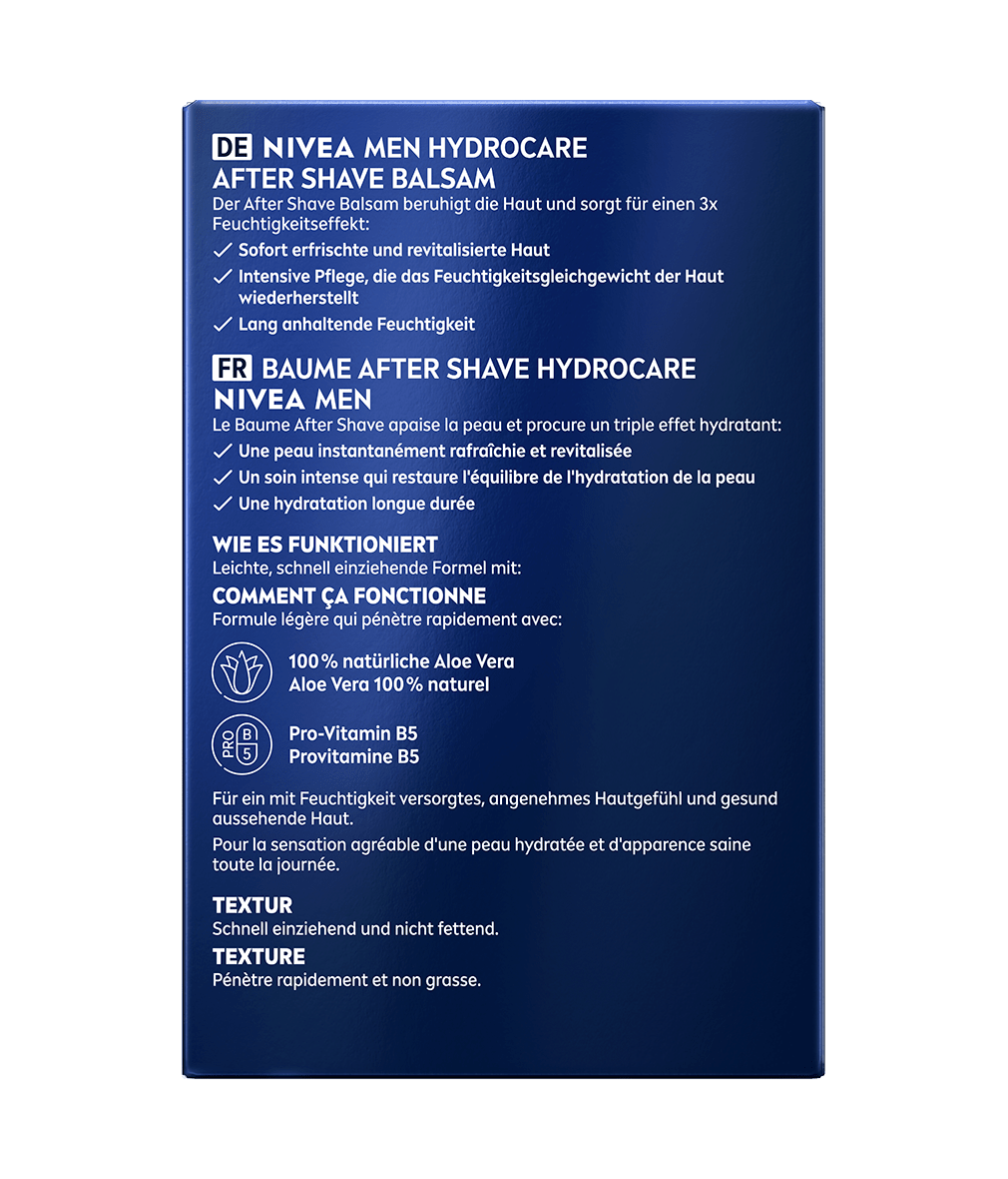 Der NIVEA MEN Hydrocare After Shave Balsam bietet einen 3x Feuchtigkeitseffekt für sofort erfrischte, revitalisierte Haut. Die leichte, schnell einziehende Formel sorgt für langanhaltende Feuchtigkeit und ein angenehmes Hautgefühl. Ideal nach der Rasur!