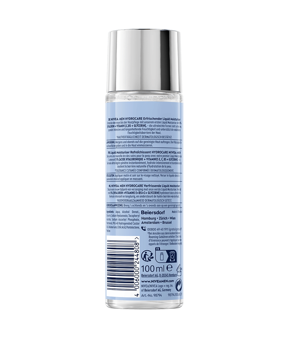Entdecke den MEN HYDROCARE Erfrischenden Liquid Moisturiser – die erste ultraleichte Formel, die sofort einzieht und intensive, langanhaltende Feuchtigkeit spendet. Angereichert mit 5 % Hyaluron, Vitamin E, C, B5 und Glycerin, revitalisiert dieser Liquid Moisturiser die Haut und unterstützt die natürliche Feuchtigkeitsbarriere. Die einzigartige Textur ist konzentriert wie ein Serum, bietet jedoch die Leichtigkeit eines Flüssigprodukts. Dermatologisch getestet und ideal für alle Hauttypen, erfrischt und regeneriert er die Haut und ist besonders wohltuend nach der Rasur.