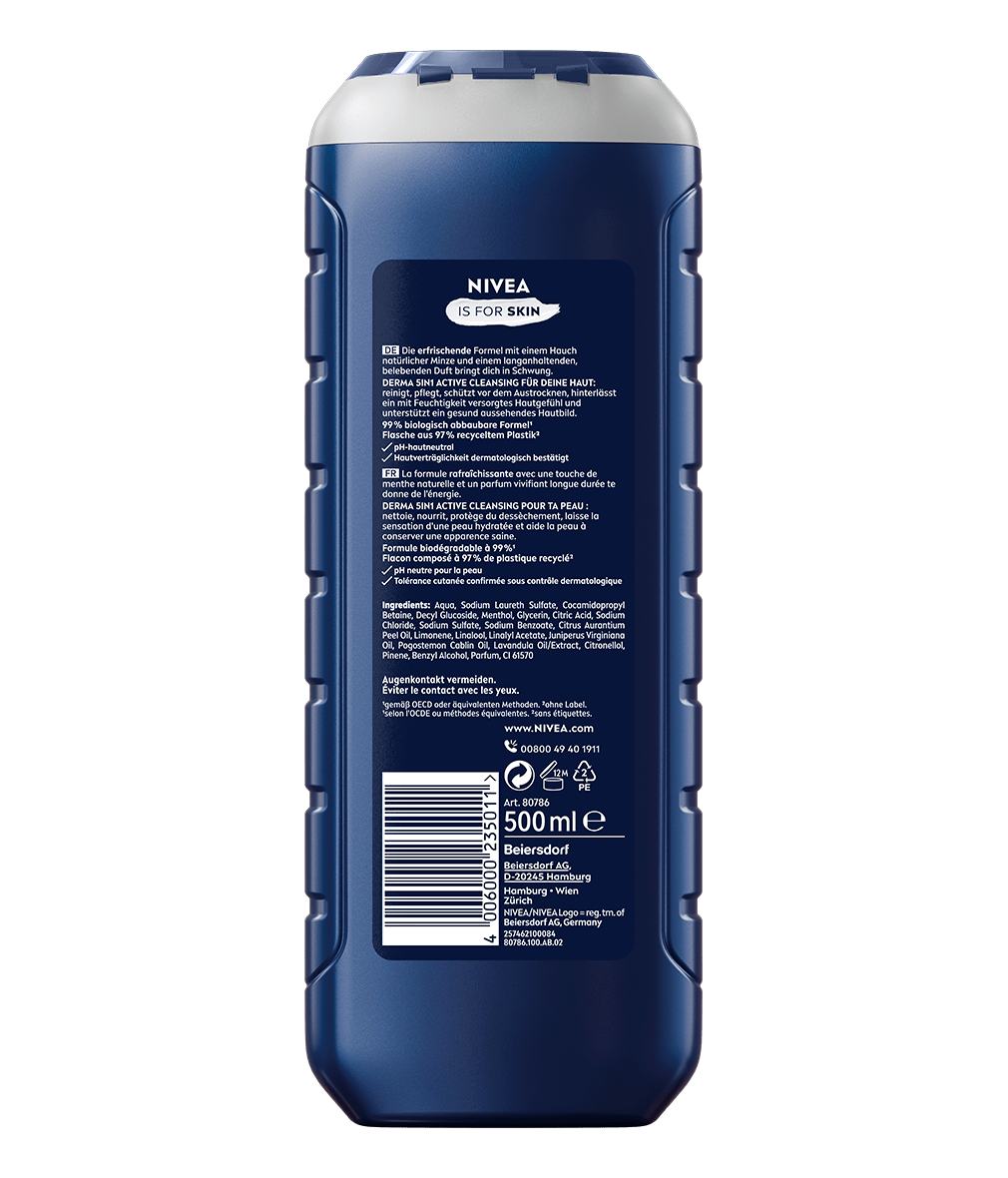 Enthalten: Aqua, Sodium Laureth Sulfate, Cocamidopropyl Betaine, Decyl Glucoside, Menthol, Glycerin, Citric Acid, Sodium Chloride, Sodium Sulfate, Sodium Benzoate, Citrus Aurantium Peel Oil, Limonene, Linalool, Linalyl Acetate, Juniperus Virginiana Oil, Pogostemon Cablin Oil, Lavandula Oil/Extract, Citronellol, Pinene, Benzyl Alcohol, Parfum, CI 61570