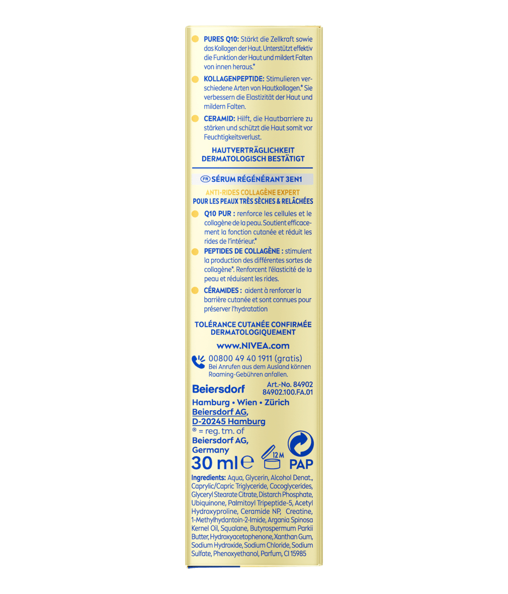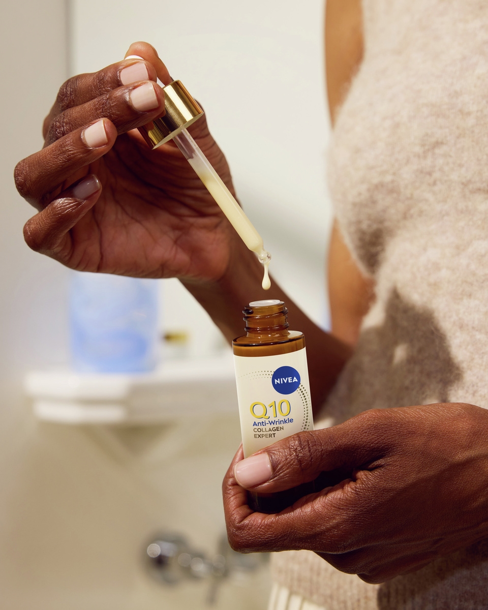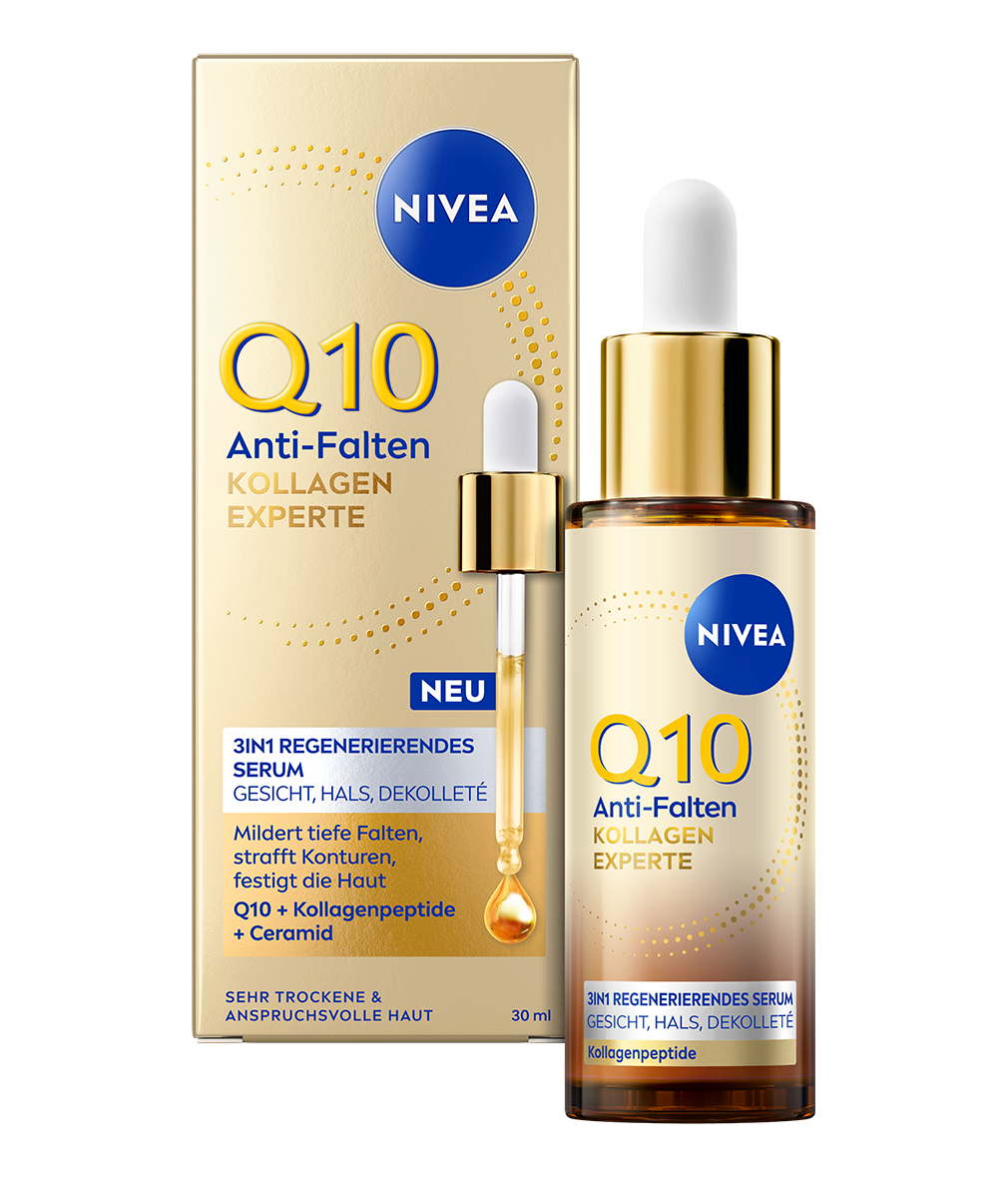 Das NIVEA Q10 Anti-Falten Kollagen Experte 3in1 Regeneriendes Serum mildert tiefe Falten, strafft die Gesichtskonturen und festigt die Haut.