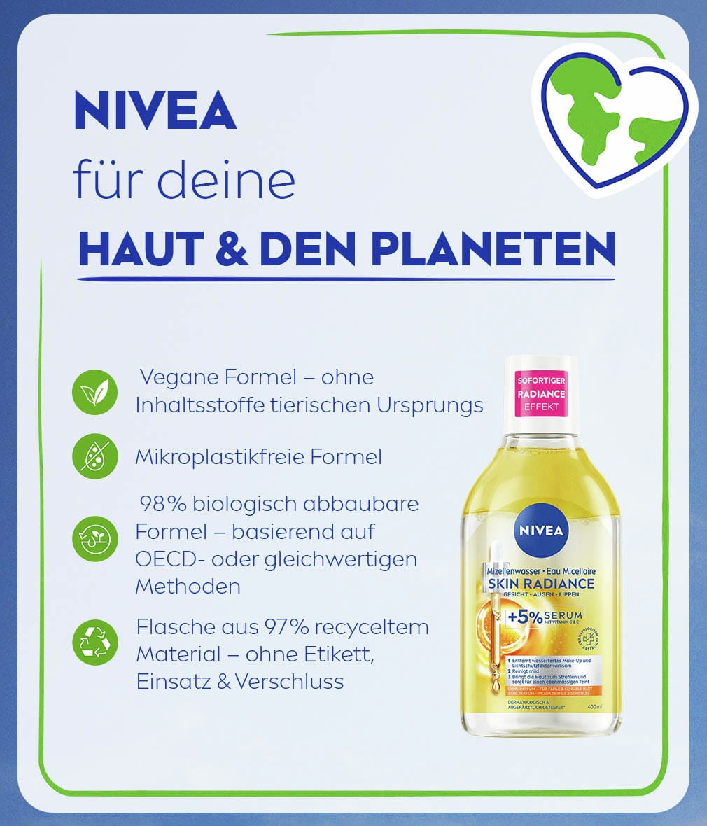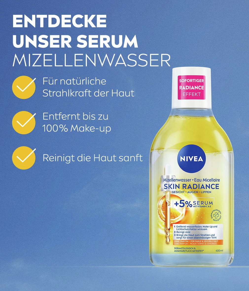 Die Gesichtsreinigung ist die Basis für gesund aussehende Haut. Unser neues NIVEA Mizellenwasser Skin Glow ist ideal für die morgendliche und abendliche Anwendung. Verwenden Sie es täglich für einen ebenmässigen, strahlenden Teint.