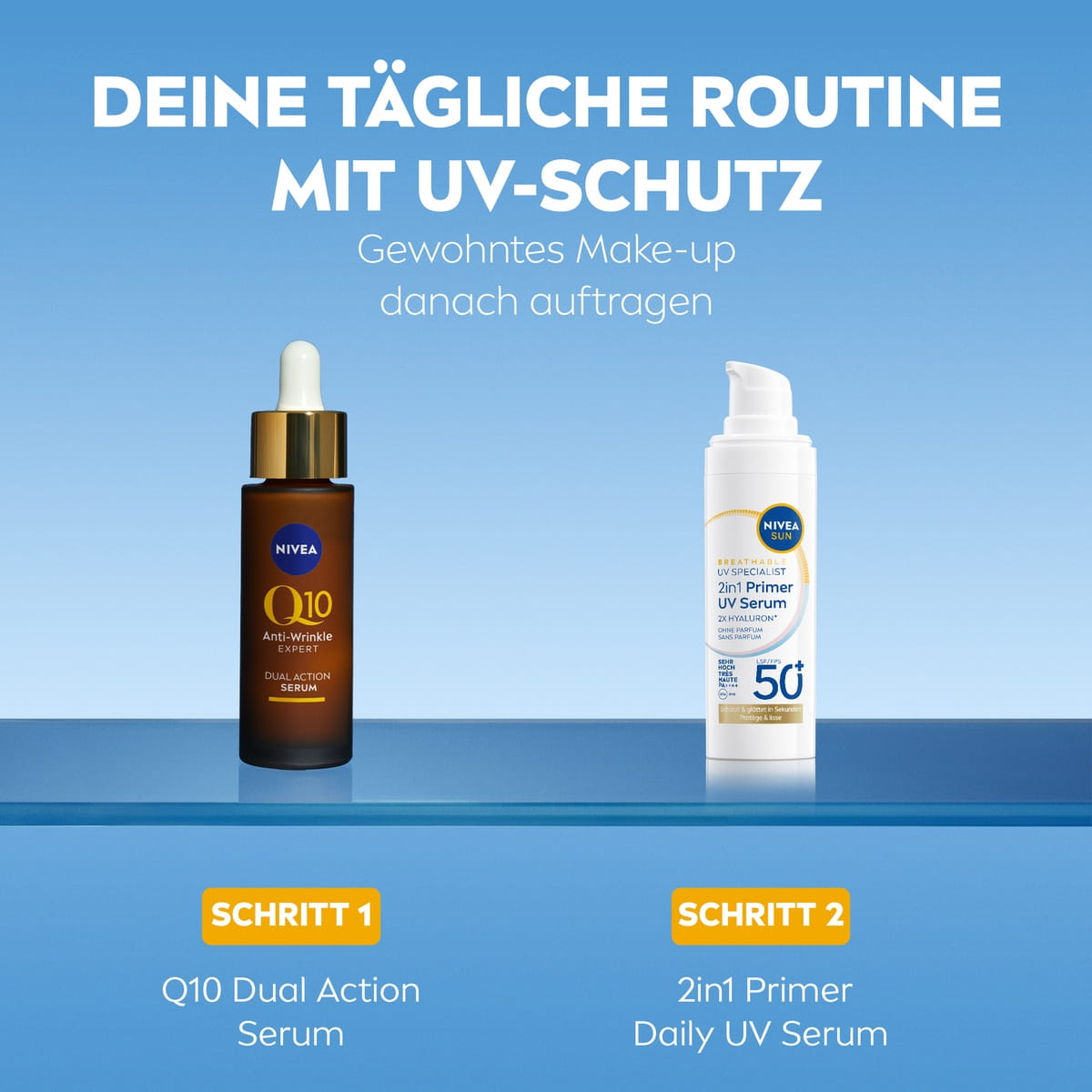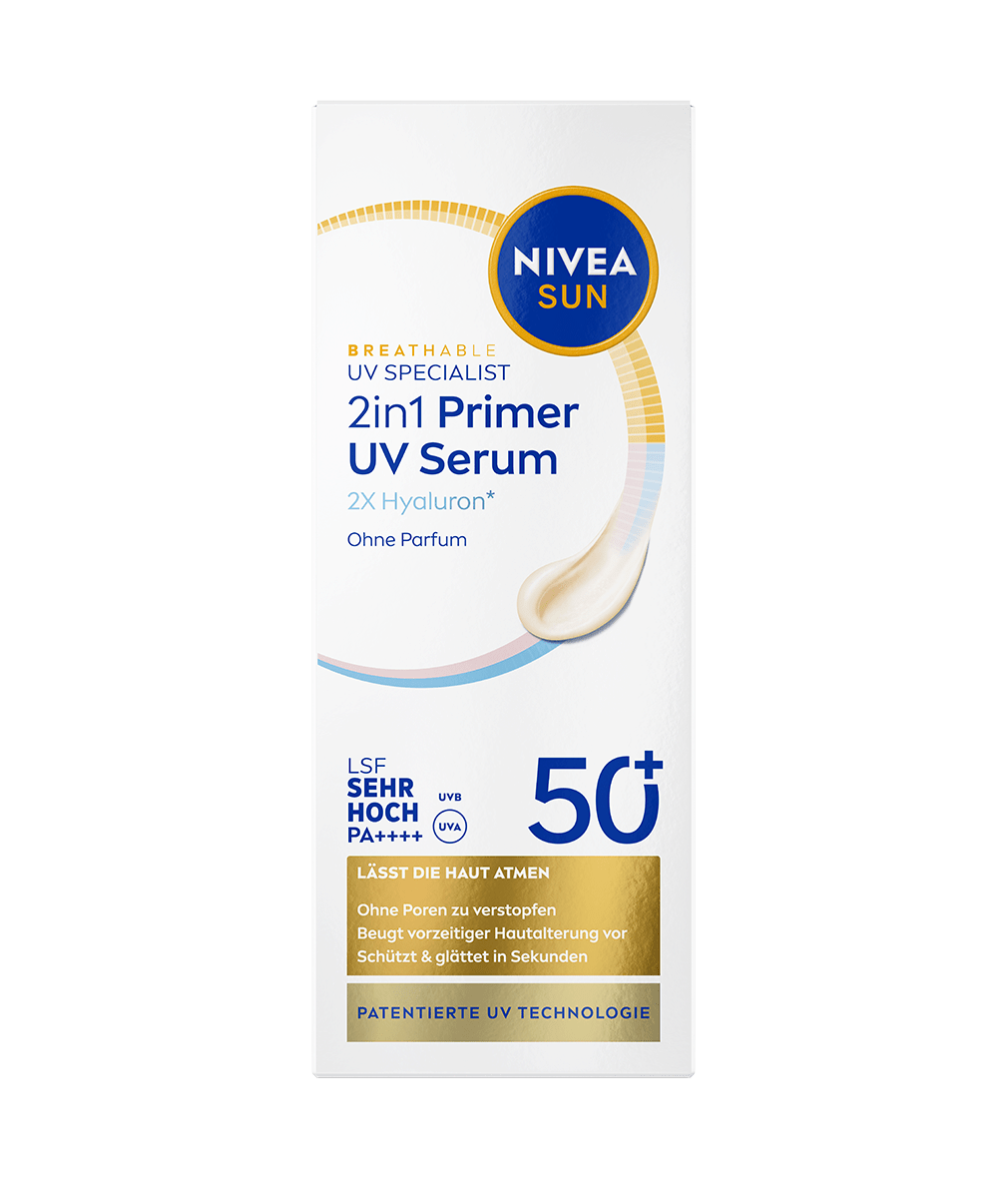 Die NIVEA SUN UV Face 2in1 Primer Daily UV Serum LSF 50+ schützt die Haut zuverlässig vor lichtbedingter Alterung, glättet sie sichtbar und bereitet sie optimal auf Make-up vor Sie sorgt dafür, dass Ihr Make-up länger hält, während Ihre Haut den ganzen Tag geschützt und gepflegt bleibt.