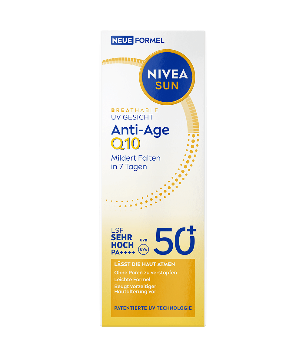 Das NIVEA SUN UV Face Anti-Age Q10 LSF 50+ schützt vor Sonnenschäden, mindert Falten und strafft die Haut bereits nach 7 Tagen, ohne die Poren zu verstopfen.