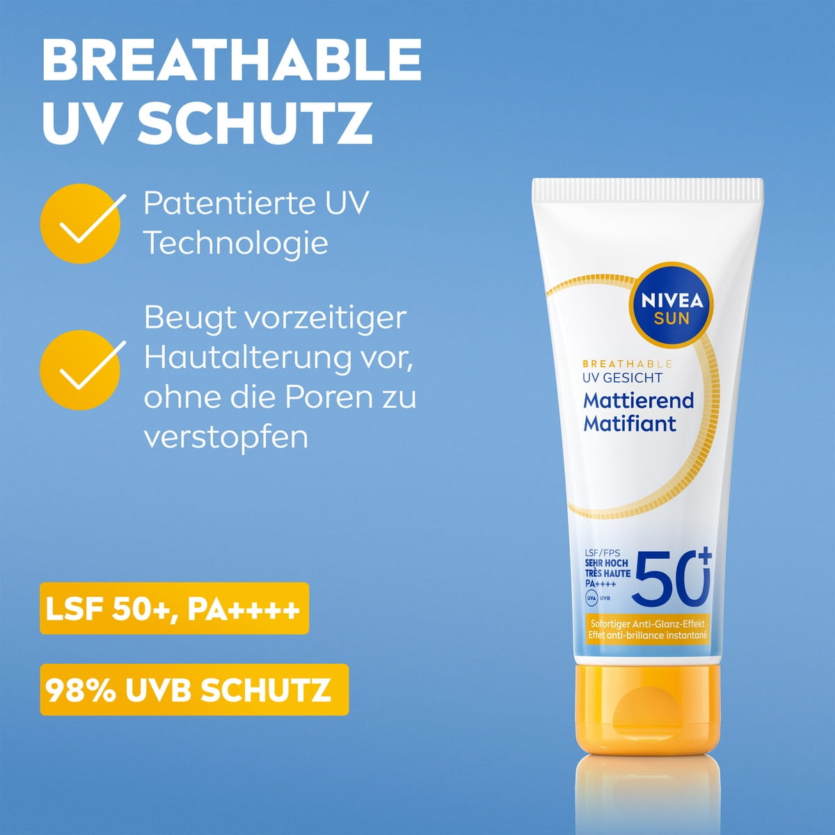 Das NIVEA SUN UV Face Shine Control LSF 50+ schützt vor Sonnenschäden, kontrolliert Ölglanz bis zu 12 Stunden und verfeinert das Hautbild, ohne die Poren zu verstopfen.