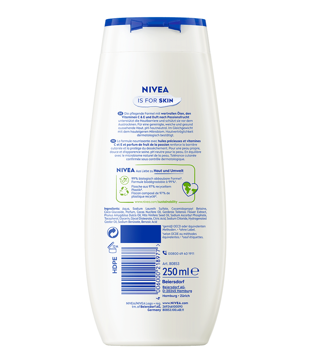 Geniesse den verwöhnenden Pflegemoment. Das milde Duschgel mit natürlichem Monoi-Öl pflegt die Haut und verwöhnt die Sinne: NIVEA Pflegedusche Passion Fruit & Monoi Oil
