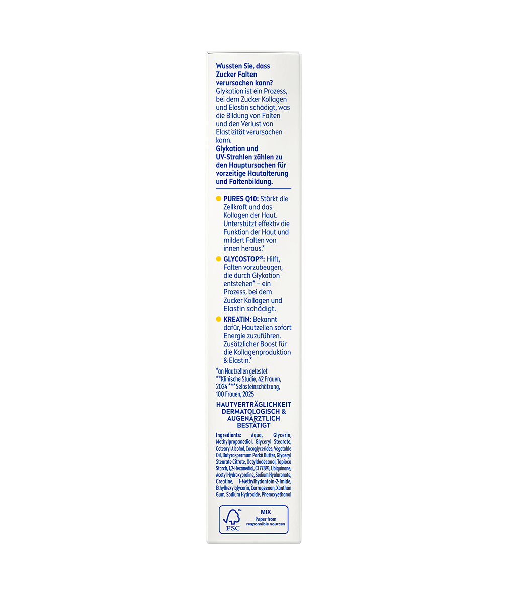 Enthalten: Aqua, Glycerin, Methylpropanediol, Glyceryl Stearate, Cetearyl Alcohol, Cocoglycerides, Vegetable Oil, Butyrospermum Parkii Butter, Glyceryl Stearate Citrate, Octyldodecanol, Tapioca Starch, 1,2-Hexanediol, CI 77891, Ubiquinone, Acetyl Hydroxyproline, Sodium Hyaluronate, Creatine, 1-Methylhydantoin-2-Imide, Ethylhexylglycerin, Carrageenan, Xanthan Gum, Sodium Hydroxide, Phenoxyethanol