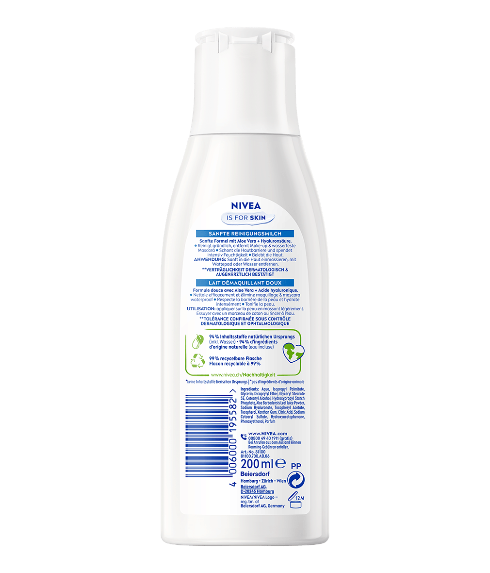 Die sanfte Reinigungsmilch mit Aloe Vera und Hyaluronsäure reinigt ihre Haut gründlich. Sie entfernt Make-Up und wasserfeste Mascara restlos und versorgt die Haut intensiv und langanhaltend mit Feuchtigkeit. Die sanfte Reinigungsmilch für das Gesicht ist für alle Hauttypen geeignet, duftet angenehm frisch und hinterlässt ein reines, gepflegtes Hautgefühl. Dermatologisch und augenärztlich in ihrer Verträglichkeit bestätigt: NIVEA Sanfte Reinigungsmilch.