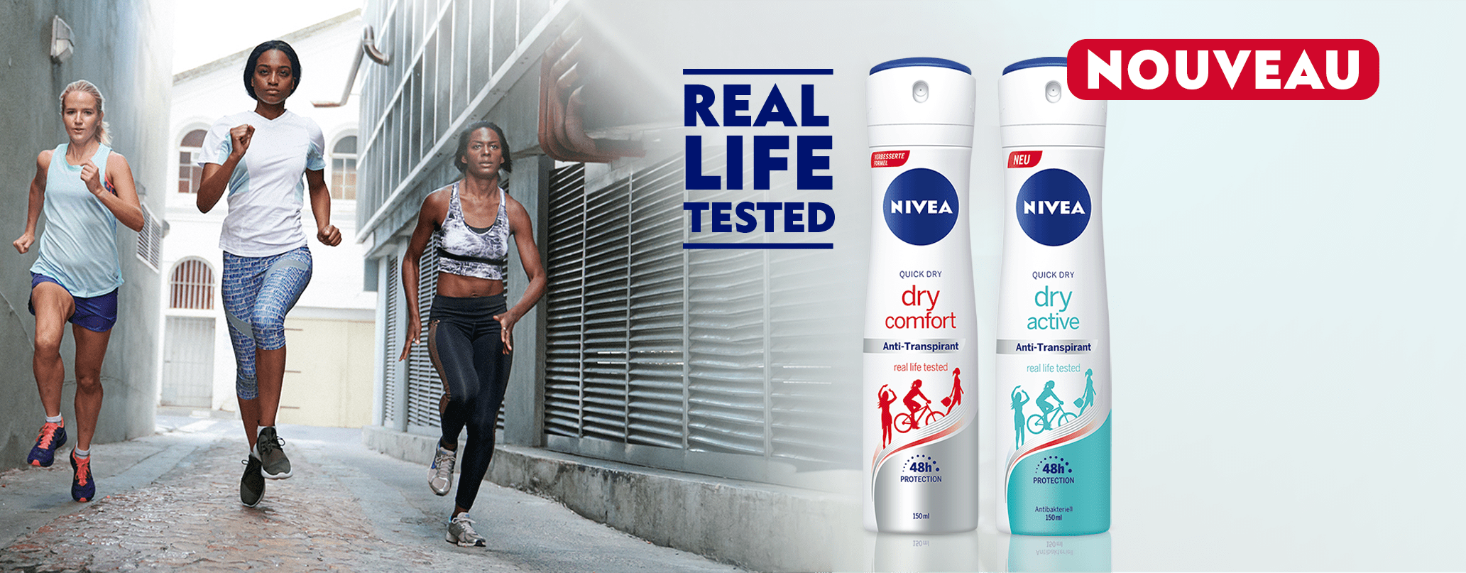 Les Déos Dry NIVEA avec formule Dual Active vous protègent efficacement pendant 48h contre les odeurs corporelles et l‘humidité sous les aisselles. Grâce à une technologie intelligente inédite mise au point par NIVEA, ceci a été confirmé par un test en conditions réelles: la vraie vie! NOUVEAU: Dry Active NIVEA au parfum frais et fleuri.
