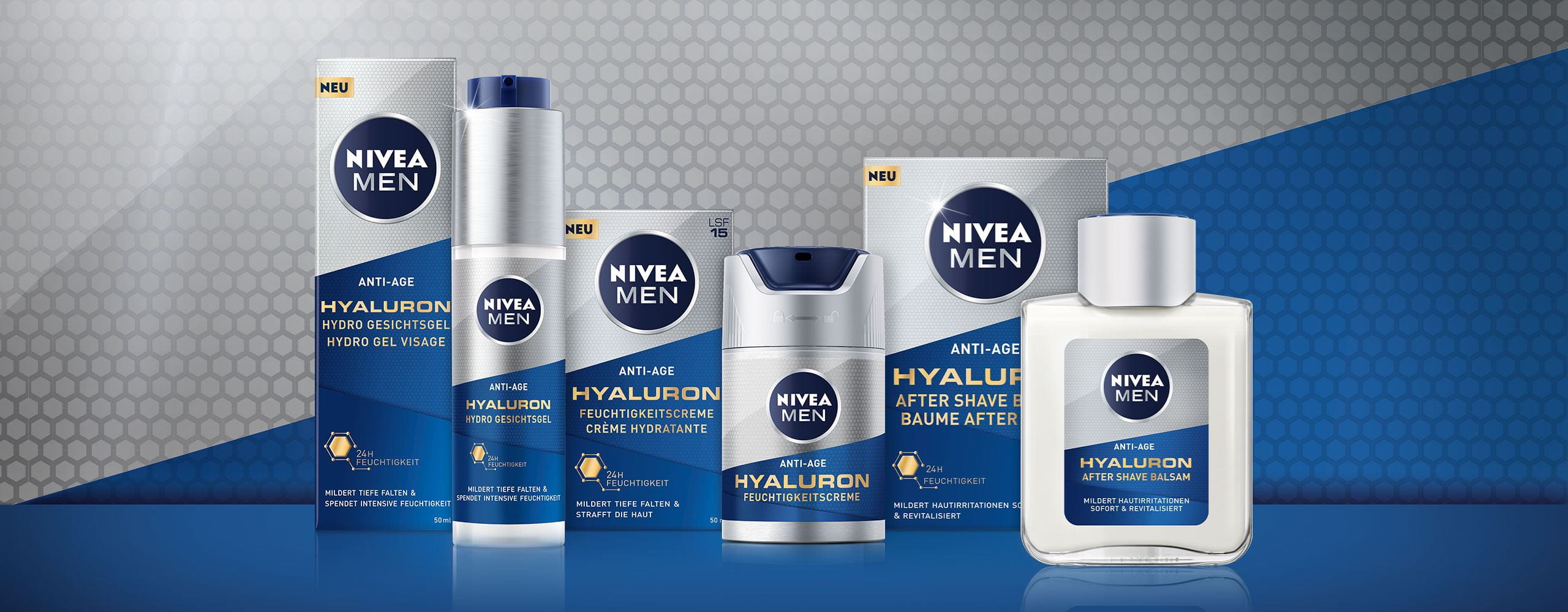 Ton visage en a déjà vu beaucoup - mais jamais encore un soin aussi puissant: nos nouveaux produits pour le visage NIVEA MEN au Hyaluron améliorent l’aspect de la peau, réduisent visiblement les rides profondes et hydratent intensément. La Crème Hydratante est l’adversaire le plus dur contre les nouvelles rides, l’Hydro Gel Visage procure à ta peau une bouffée supplémentaire de fraîcheur et le Baume After Shave apaise définitivement la peau après le rasage. Le soin n’a jamais été aussi masculin.