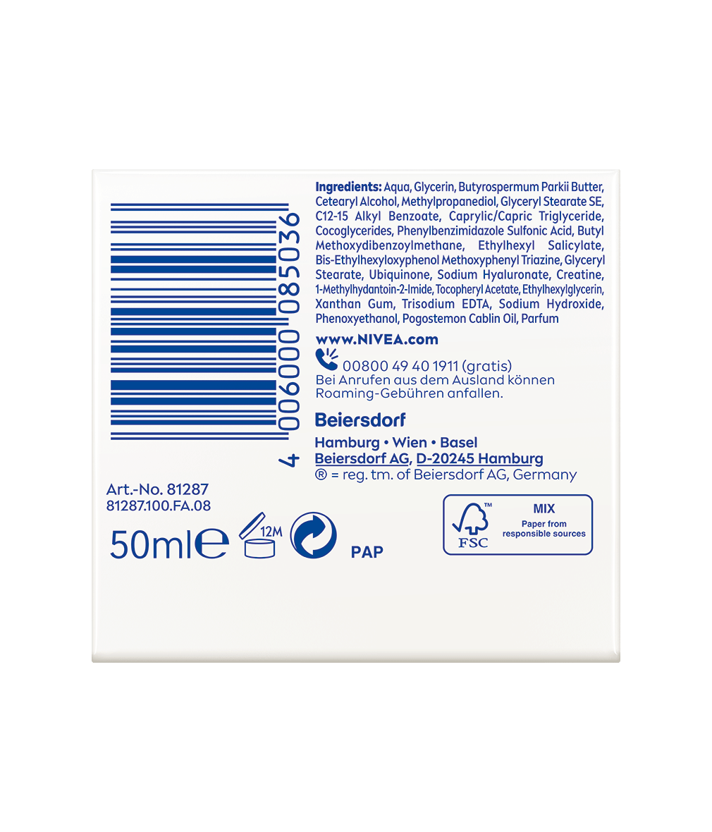 Inclus: Aqua, Glycerin, Butyrospermum Parkii Butter, Cetearyl Alcohol, Methylpropanediol, Glyceryl Stearate SE, C12-15 Alkyl Benzoate, Caprylic/Capric Triglyceride, Cocoglycerides, Phenylbenzimidazole Sulfonic Acid, Butyl Methoxydibenzoylmethane, Ethylhexyl Salicylate, Bis-Ethylhexyloxyphenol Methoxyphenyl Triazine, Glyceryl Stearate, Ubiquinone, Sodium Hyaluronate, Creatine, 1-Methylhydantoin-2-Imide, Tocopheryl Acetate, Ethylhexylglycerin, Xanthan Gum, Trisodium EDTA, Sodium Hydroxide, Phenoxyethanol, Pogostemon Cablin Oil, Parfum