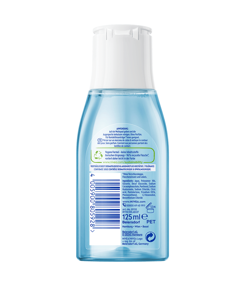 Le Démaquillant doux pour les yeux NIVEA enrichi en acide hyaluronique élimine efficacement le mascara et le maquillage. Il apaise la peau sensible et la protège du dessèchement et des irritations. La formule douce sans huile et sans parfum laisse la sensation d’une peau fraîche et nette. Sa tolérance est confirmée sous contrôle dermatologique et ophtalmologique et convient également aux personnes portant des lentilles de contact.