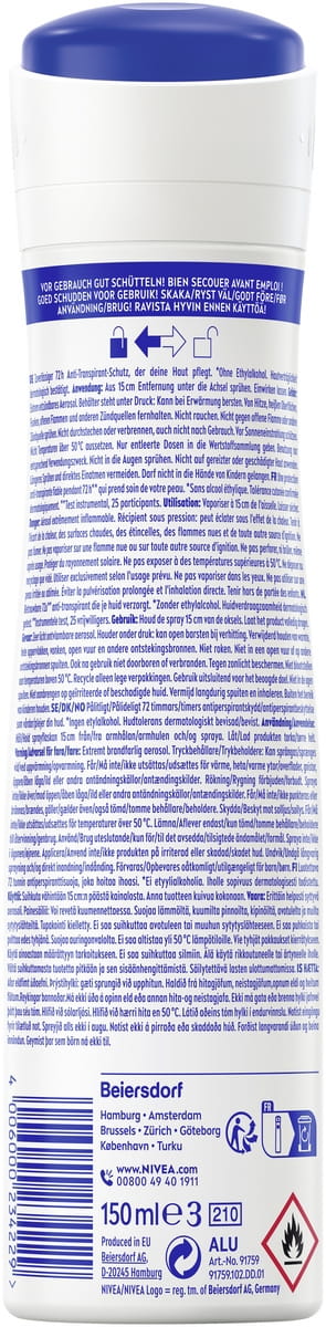 Danger: Aérosol extrêmement inflammable. Récipient sous pression: peut éclater sous l'effet de la chaleur. Tenir à l'écart de la chaleur, des surfaces chaudes, des étincelles, des flammes nues et de toute autre source d'ignition. Ne pas fumer. Ne pas vaporiser vers une flamme nue ou sur toute autre source d'ignition. Ne pas vaporiser dans les yeux. Ne pas utiliser sur une peau irritée ou abîmée. Ne pas perforer, ni brûler, même après usage. Utiliser exclusivement le produit pour l’usage prévu. Protéger du rayonnement solaire. Ne pas exposer à des températures supérieures à 50°C. Tenir hors de portée des enfants. Ne déposer au recyclage que vidé.
