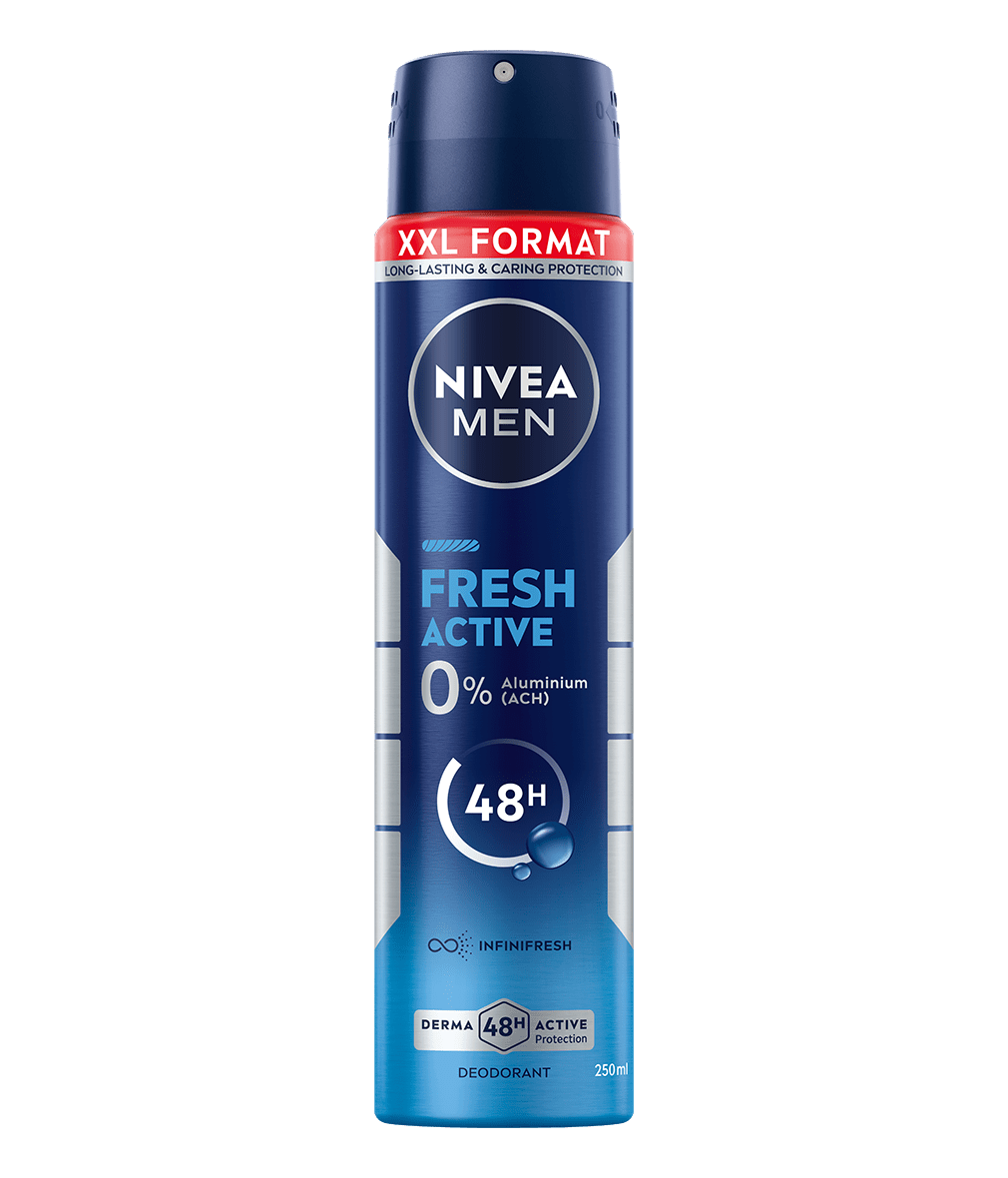 Déodorant Spray Fresh Active NIVEA MEN avec formule INFINIFRESH qui combat activement les bactéries responsables des odeurs et possède un parfum frais longue durée.