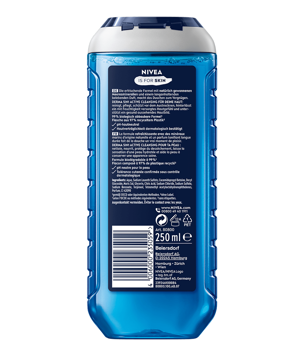 PRÊT POUR ENCORE PLUS DE FRAÎCHEUR ? Le gel-douche de soin Fresh Ocean NIVEA MEN assure une fraîcheur longue durée et la sensation d’une peau revitalisée et soignée. Son parfum masculin et sa formule de soin aux minéraux marins offrent à la peau un soin parfait sous la douche. Le gel-douche possède un pH neutre pour la peau et sa tolérance cutanée est confirmée sous contrôle dermatologique.