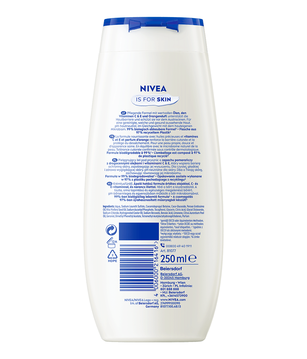Savourez un agréable moment de soin. Ce gel-douche à l'huile naturelle d'avocat prend soin de la peau et son parfum délicat d'orange chouchoute les sens: Douche Soin Orange & Avocado Oil NIVEA