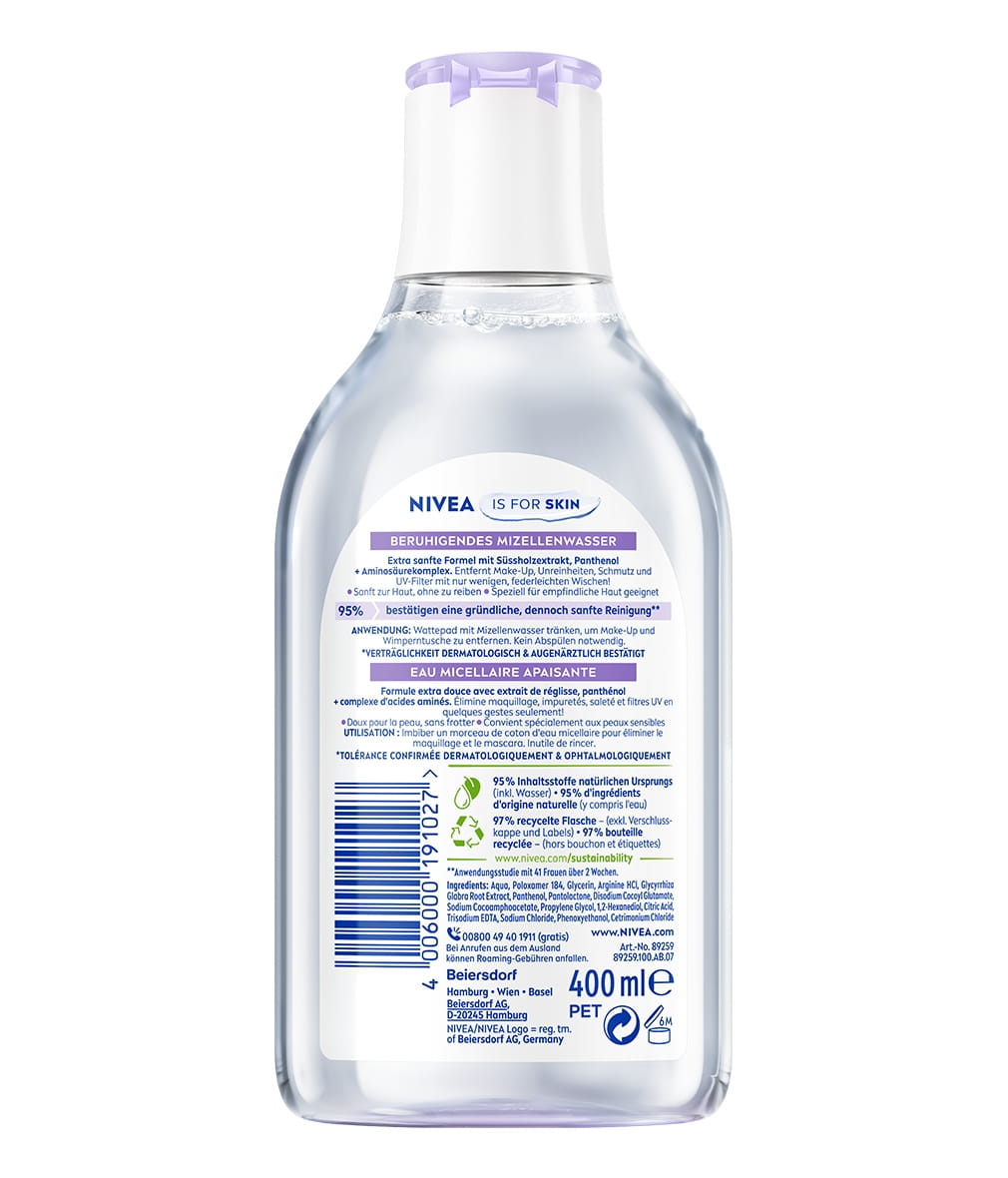 L’Eau Micellaire Apaisante NIVEA pour peaux sensibles contient un complexe d’acides aminés, du panthénol et de l'extrait de réglisse pour nettoyer en douceur, démaquiller, hydrater et apaiser la peau sans laisser de résidus.