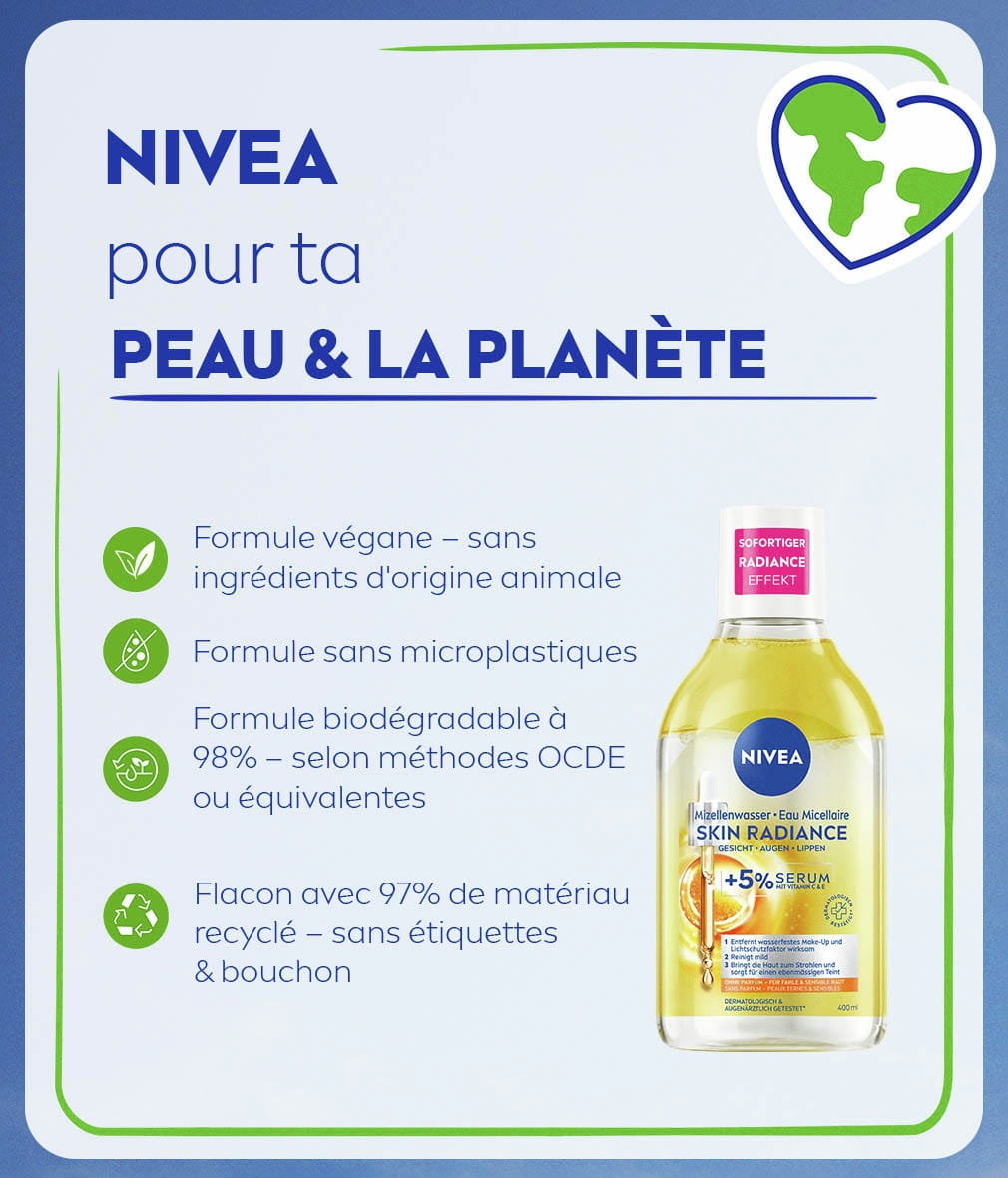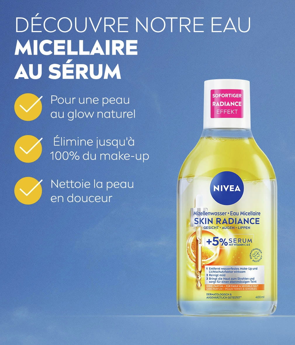 Le nettoyage du visage, c'est la base pour une peau d'apparence saine. Notre nouvelle Eau Micellaire Skin Radiance NIVEA est idéale pour être une utilisation matin et soir. Utilisez-la quotidiennement pour un teint unifié et lumineux.