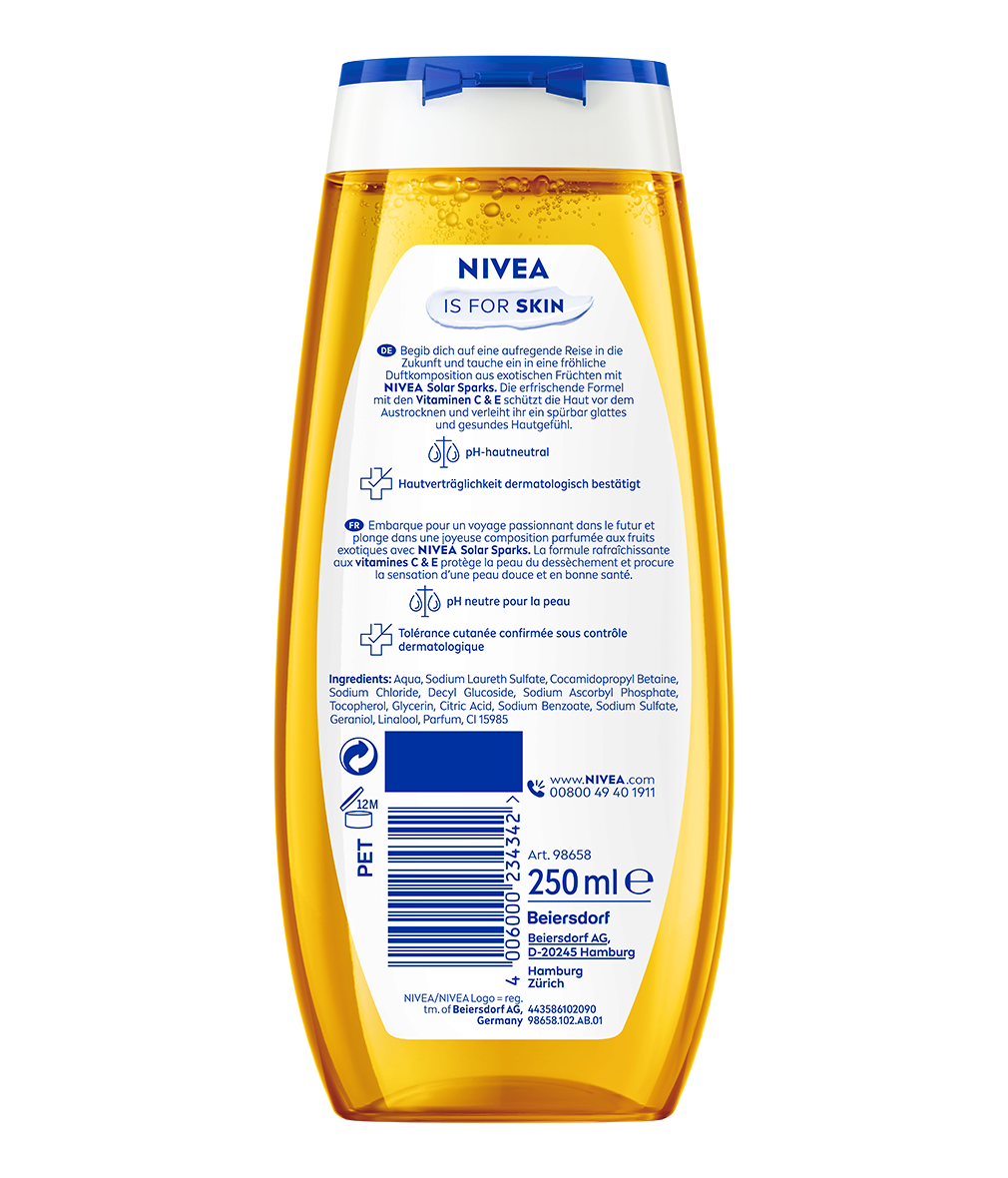 Rafraîchis-toi et chouchoute-toi avec la Douche de Soin Tropical Sunrise en édition limitée. Sa composition parfumée à la senteur de fruits exotiques rafraîchit la peau et sa formule la protège du dessèchement et lui procure une agréable sensation de confort. La tolérance cutanée est confirmée sous contrôle dermatologique. NIVEA prend soin de ta peau et de notre planète avec une formule sans microplastiques et biodégradable à 99%.