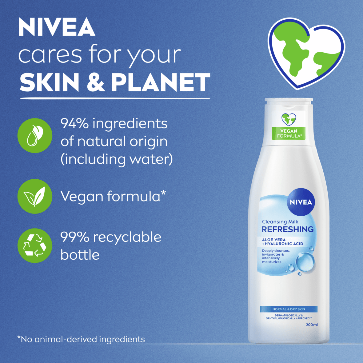 Le Lait Démaquillant Doux avec Aloe Vera nettoie la peau en profondeur. Il élimine le maquillage et le mascara waterproof sans laisser de résidus et hydrate intensément et durablement la peau. Ce Lait Démaquillant Doux pour le visage convient à tous les types de peau, possède un parfum agréablement frais et laisse la sensation d'une peau nette et soignée. Sa tolérance est confirmée sous contrôle dermatologique et ophtalmologique : Lait Démaquillant Doux NIVEA.