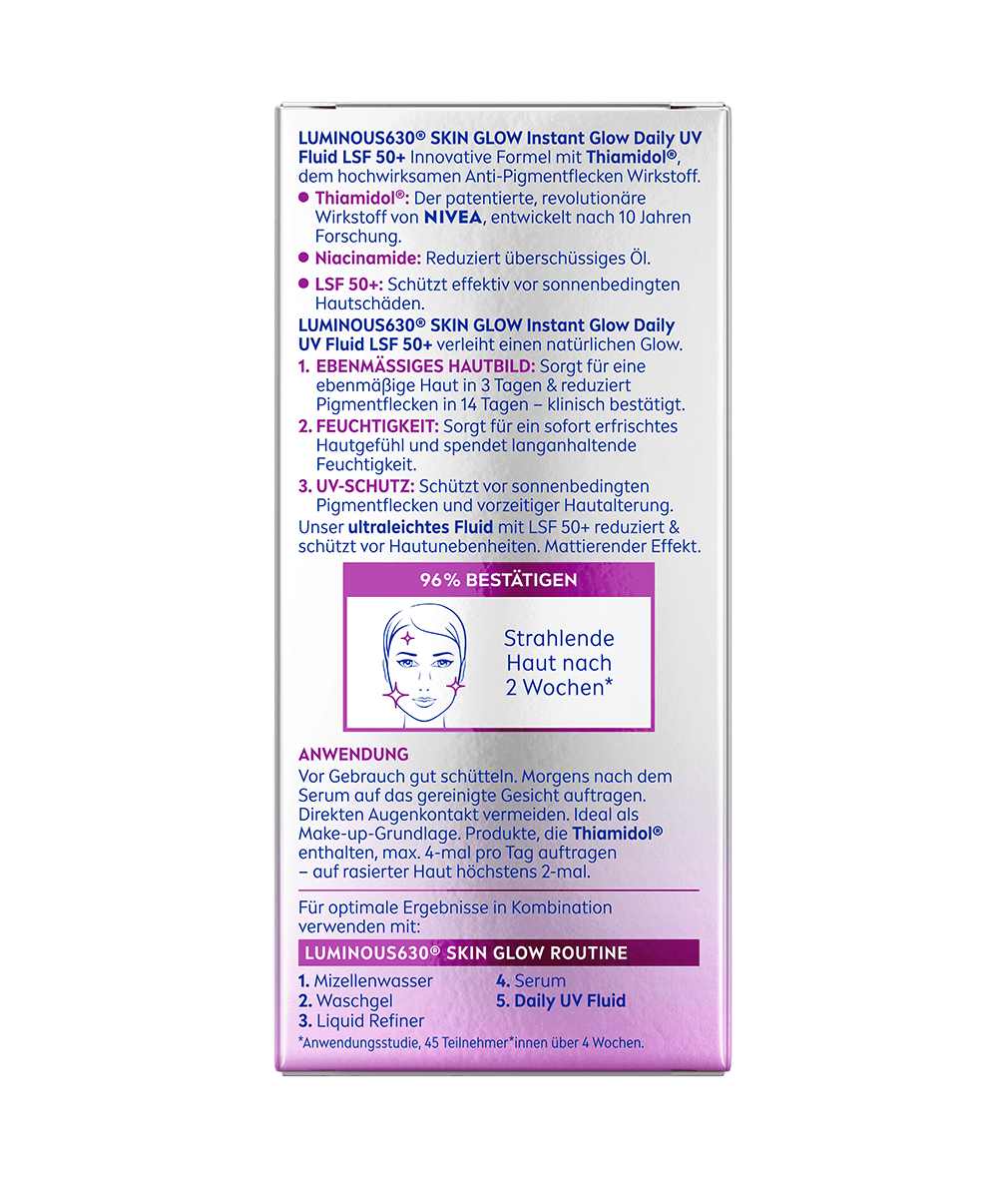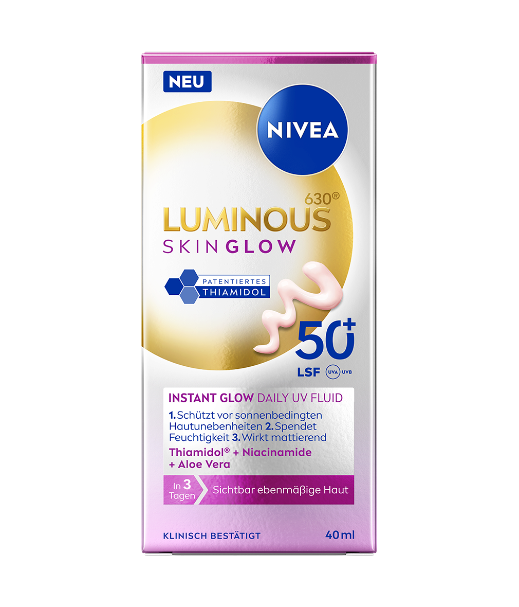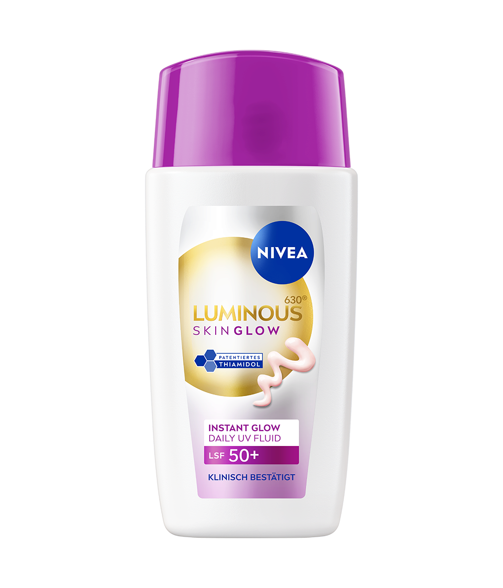 Notre Daily Fluide Instant Glow Luminous Skin Glow NIVEA ultra léger avec FPS 50+ réduit & protège contre les imperfections cutanées.