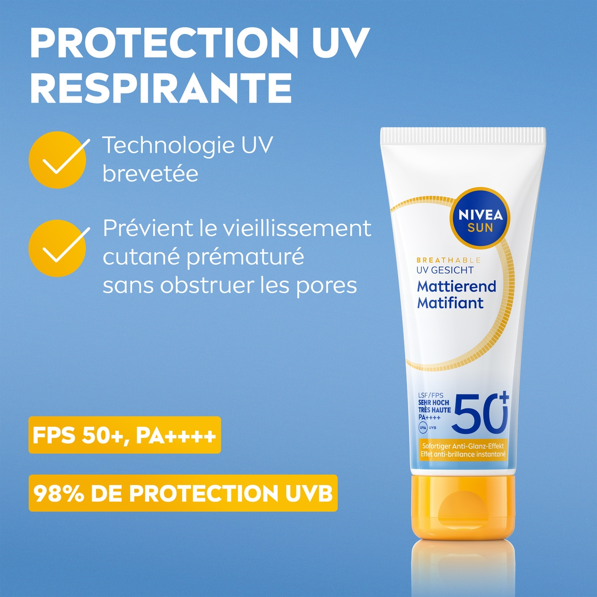 NIVEA SUN UV Face Shine Control FPS 50+ protège contre les dommages induits par le soleil, contrôle la brillance jusqu'à 12 heures et resserre le grain de peau sans obstruer les pores.