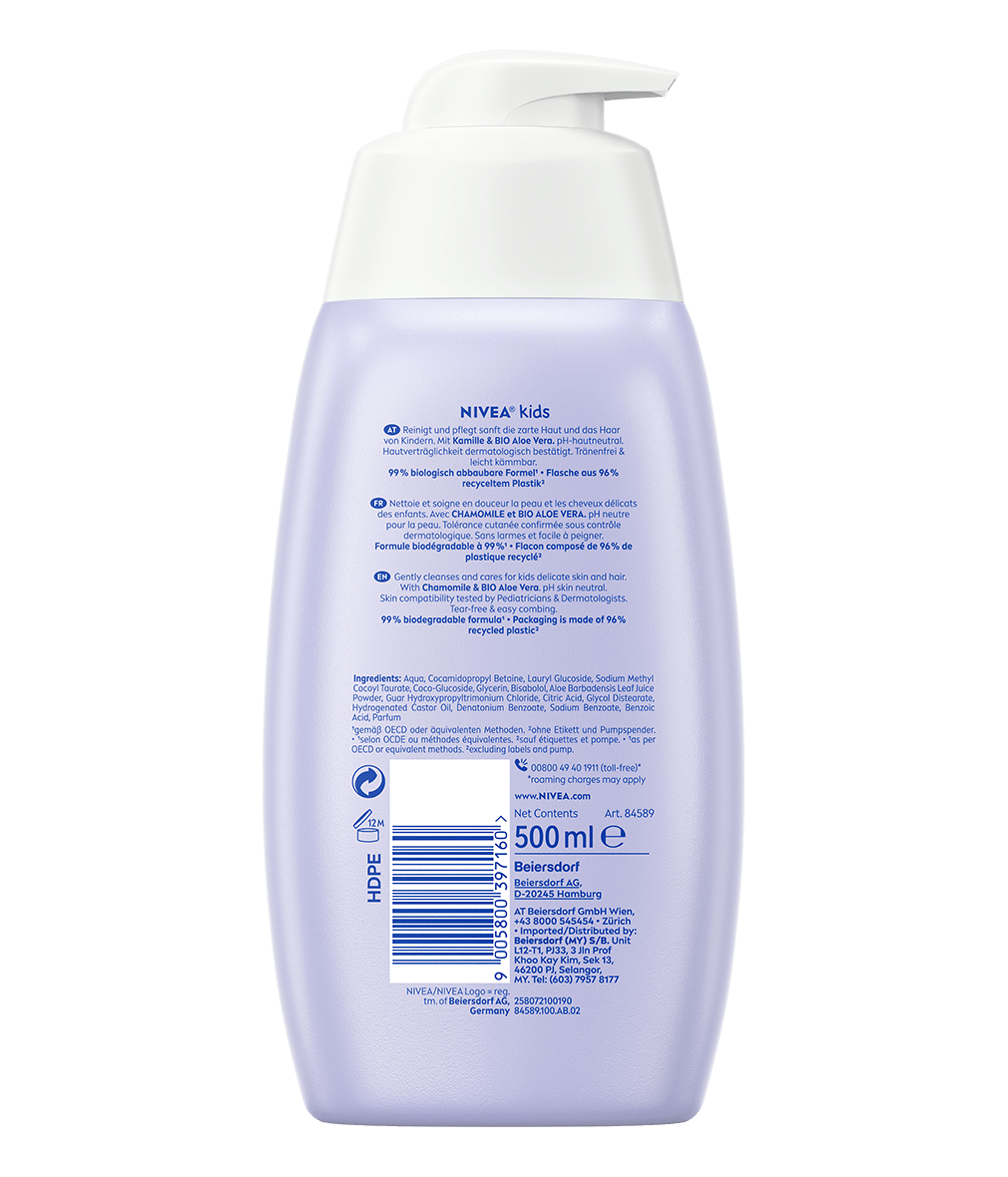 Le Gel-Douche & Shampooing 2en1 avec Aloe Vera Bio & Camomille nettoie en douceur la peau & les cheveux sensibles des enfants et en prend soin: Shower & Shampoo 2in1 Girl NIVEA Kids