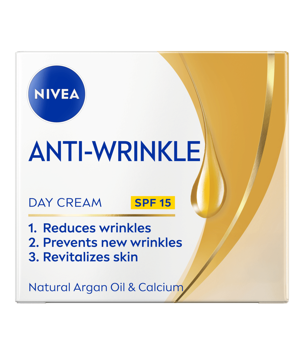 Le Soin de Jour Anti-Rides 55+ NIVEA avec huile nourrissante d’Argan, calcium et FPS 15 revitalise la peau mature exigeante et atténue visiblement les rides.