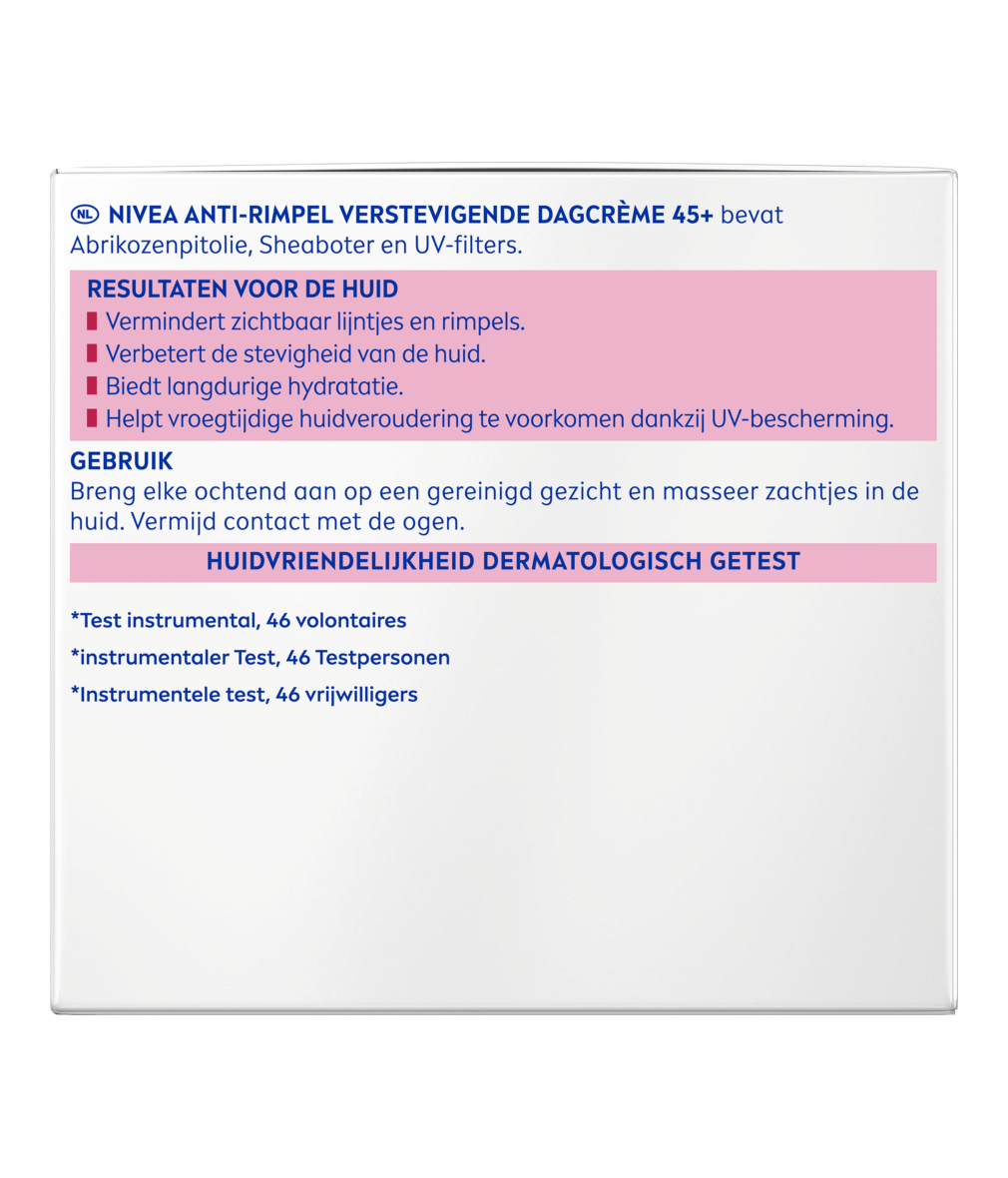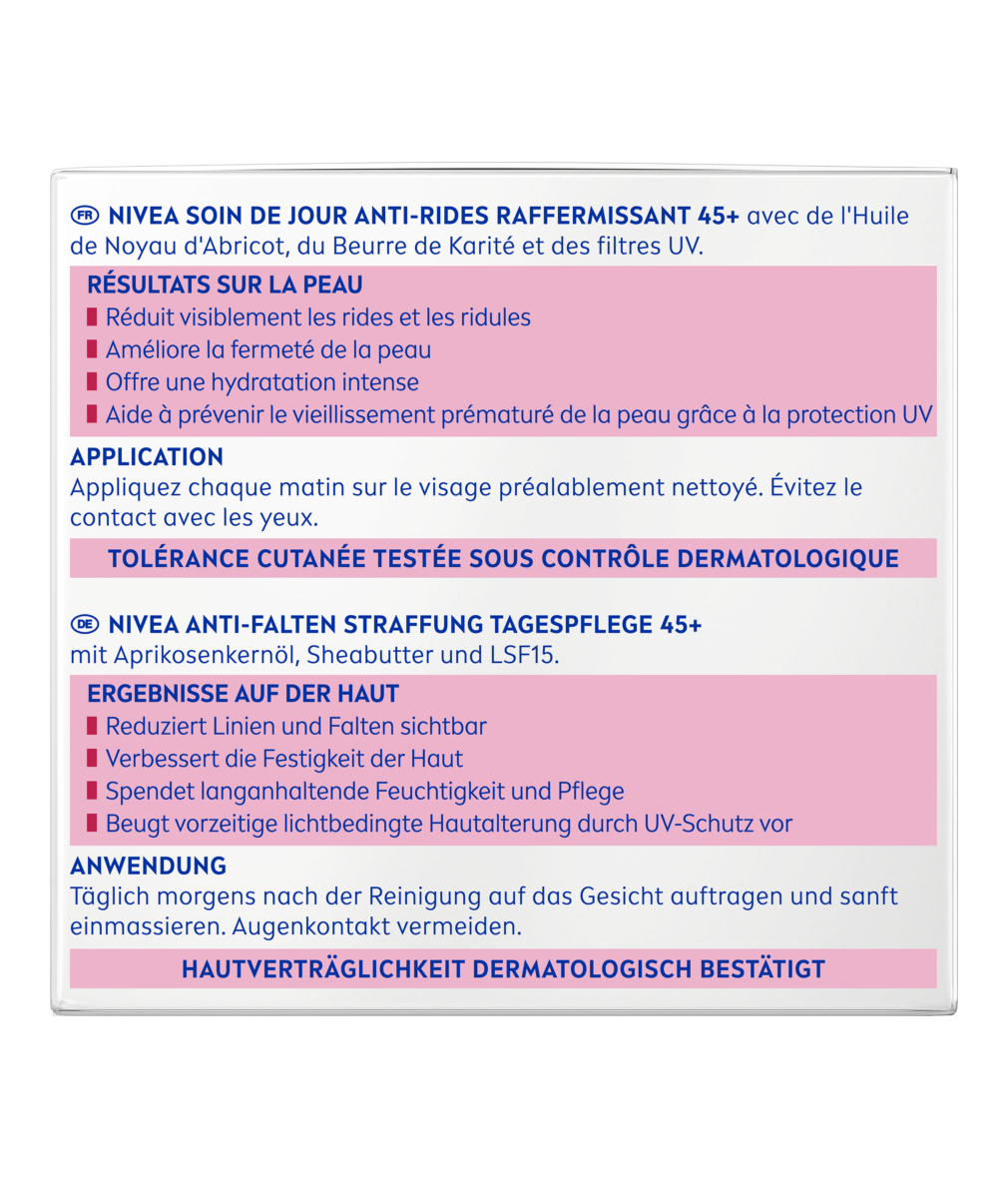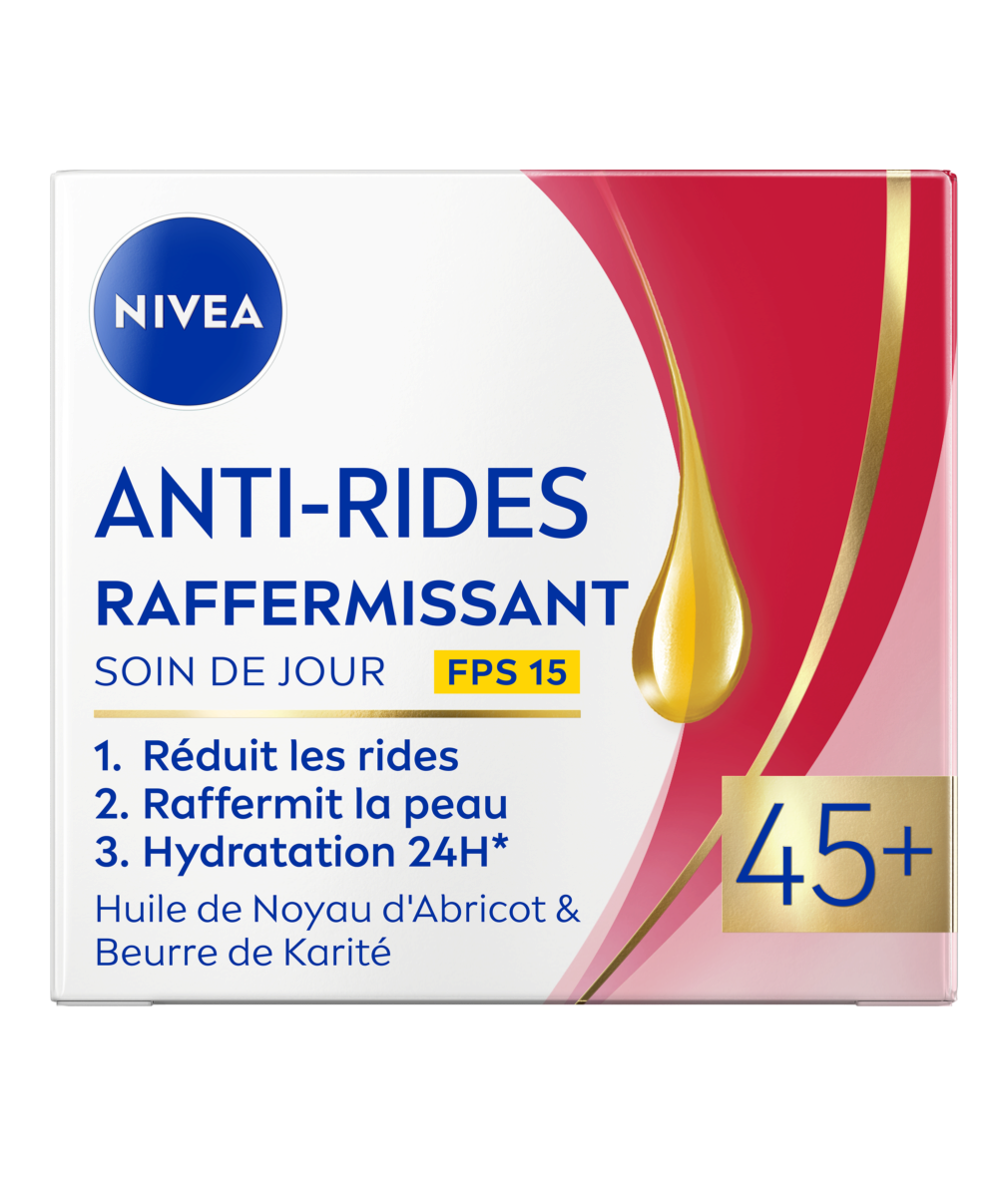 Le Soin de Jour Anti-Rides 45+ NIVEA avec huile de noyau d'abricot et beurre de karité nourrit intensément lap eau et améliore sa fermeté et sa tonicité.