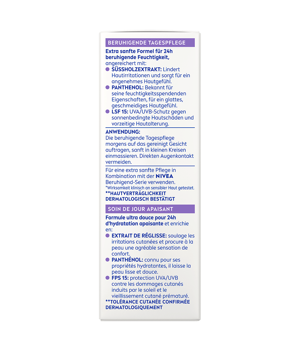 Ce soin de jour pour peaux sensibles hydrate intensément ta peau pendant 24 heures. La crème avec un FPS 15 réduit les signes de peau sensible tels que les rougeurs, la sécheresse et les sensations de tiraillement.