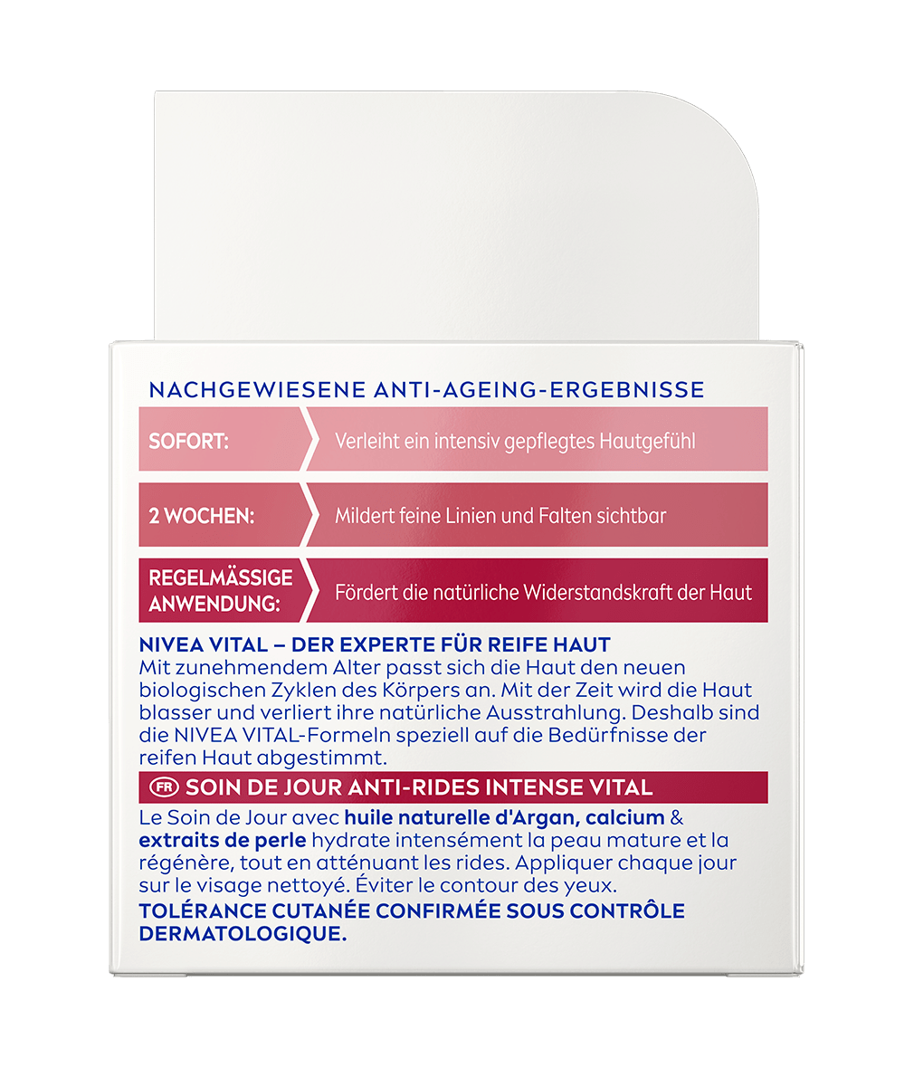 Le Soin de Jour Intense Anti-Rides NIVEA Vital hydrate intensément la peau mature et la régénère, tout en atténuant les rides.