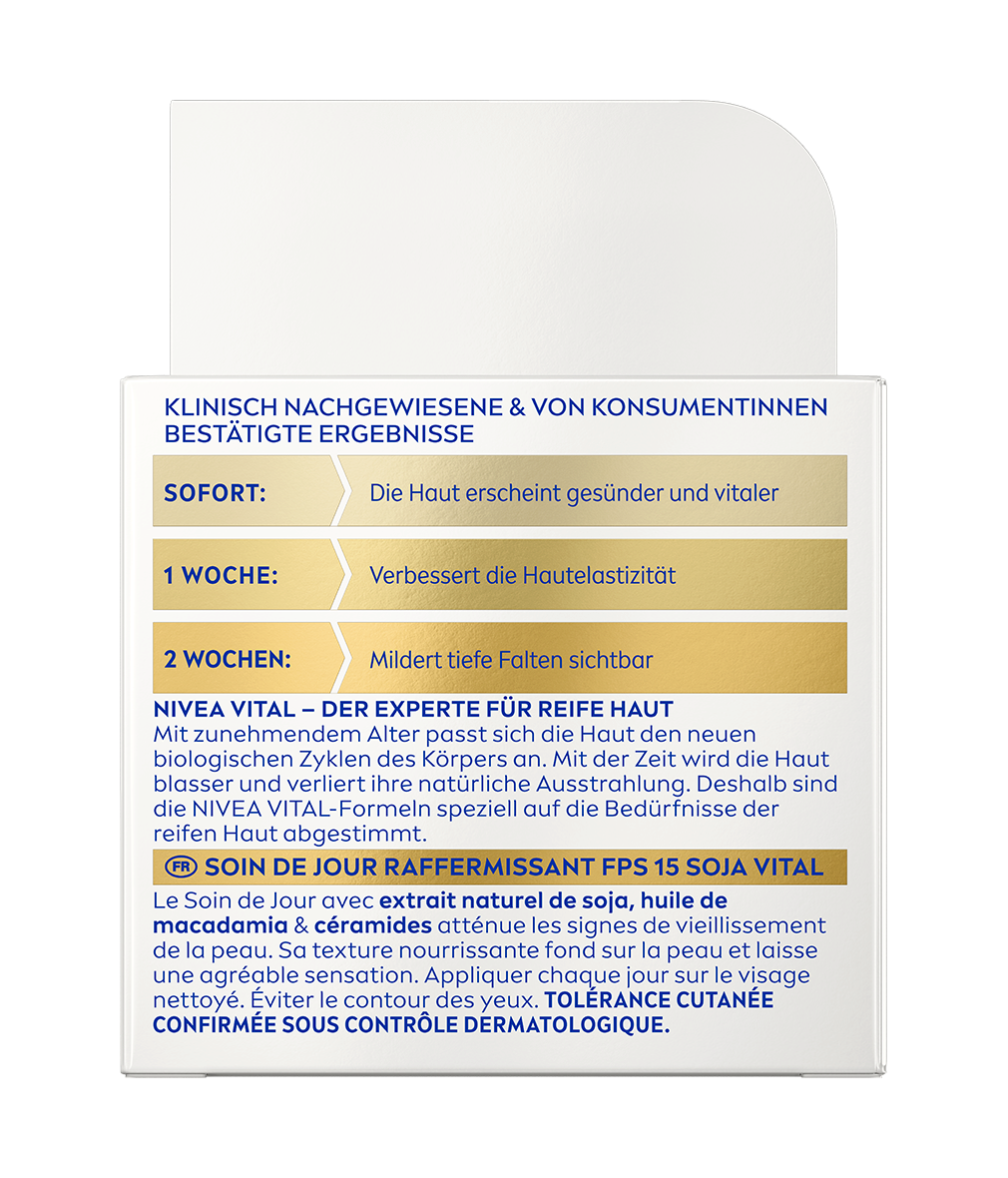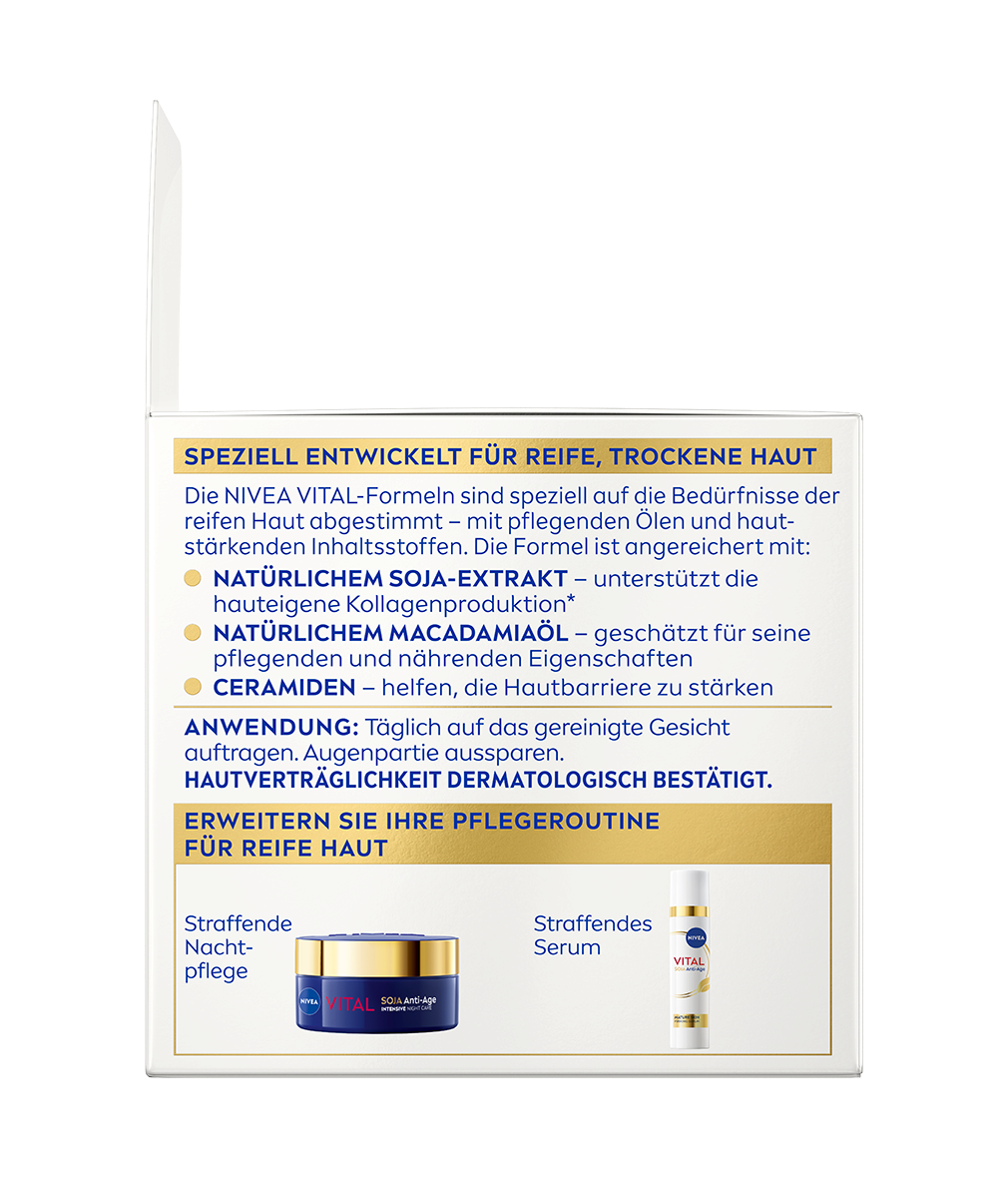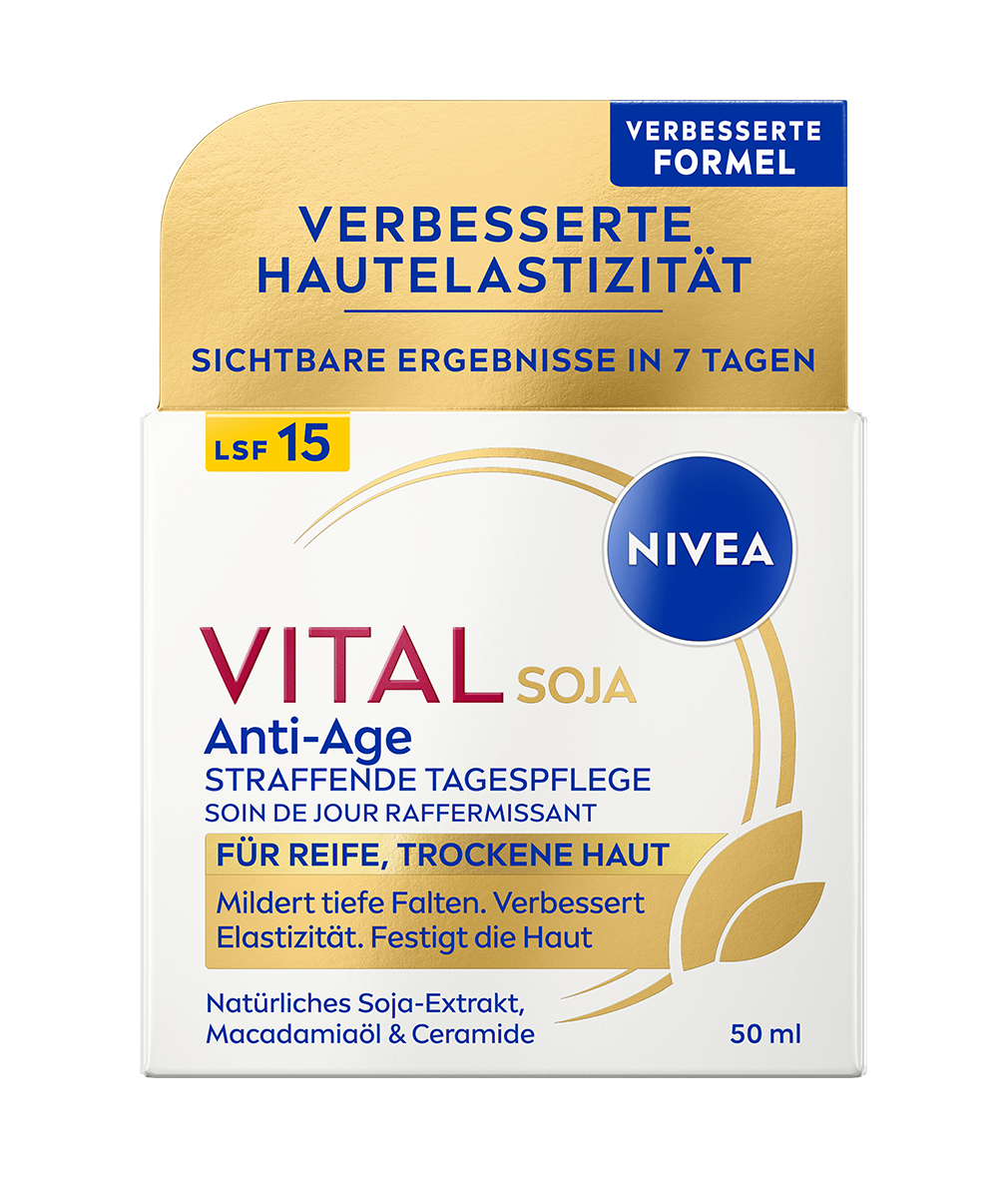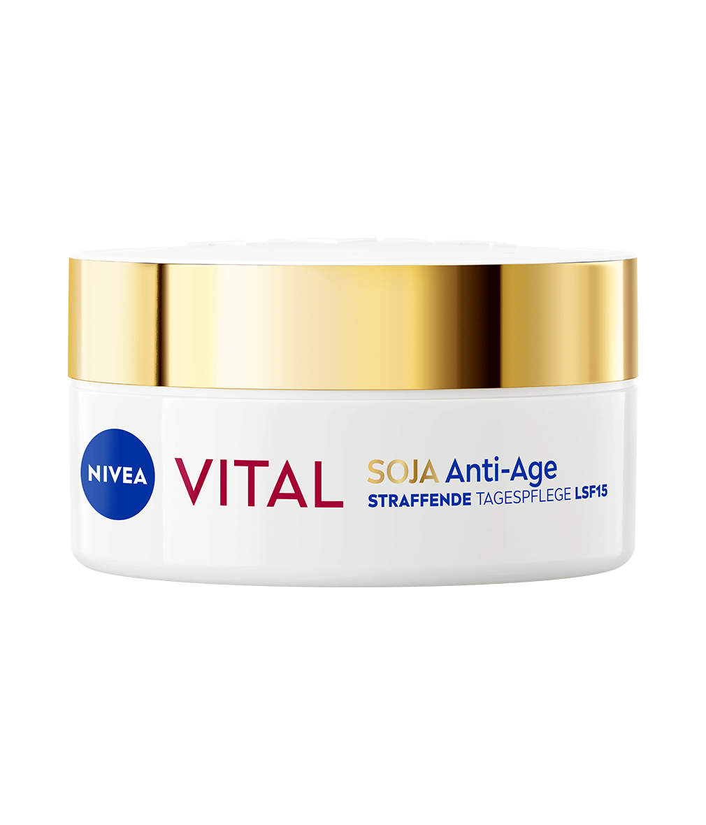 Le Soin de Jour Raffermissant Anti-Age Soja NIVEA Vital réduit les signes visible du vieillissement de la peau mature. Sa texture onctueuse fond sur lapeau et procure toute la journée une sensation agréable de confort.
