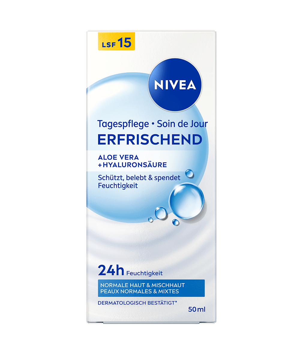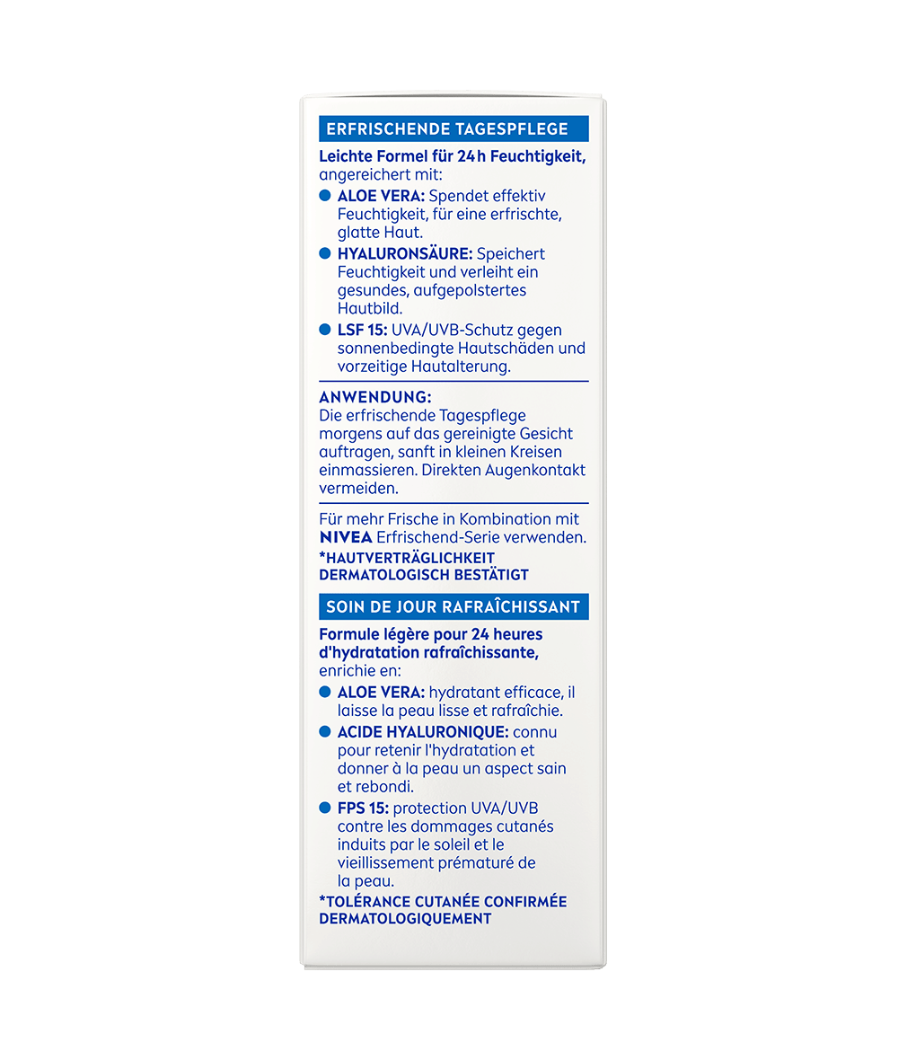 Le Soin de Jour Rafraîchissant FPS 15 NIVEA possède une formule légère qui pénètre rapidement, rafraîchit la peau et l'hydrate instantanément. Pour une peau immédiatement rafraîchie, lisse et d'apparence saine.