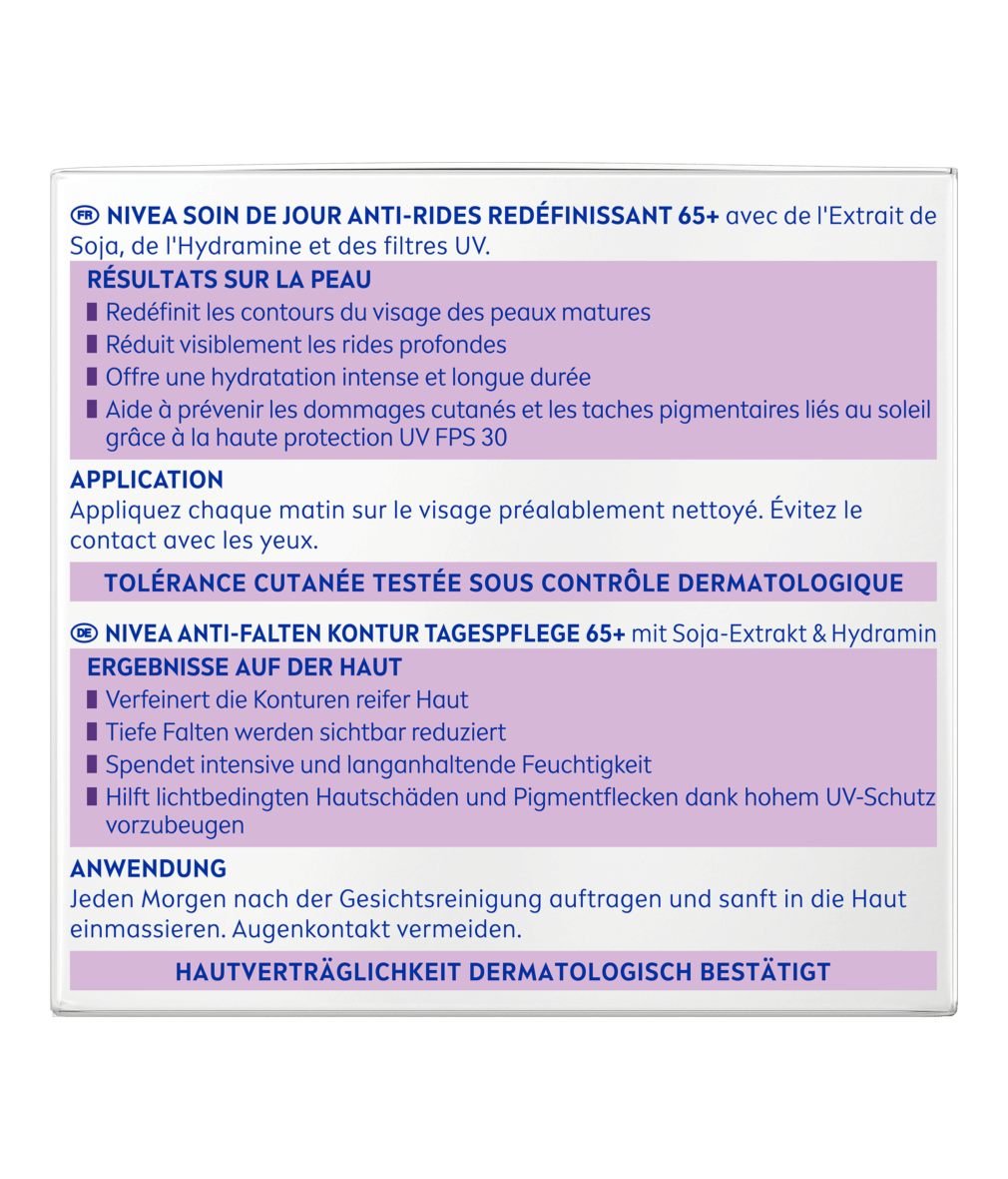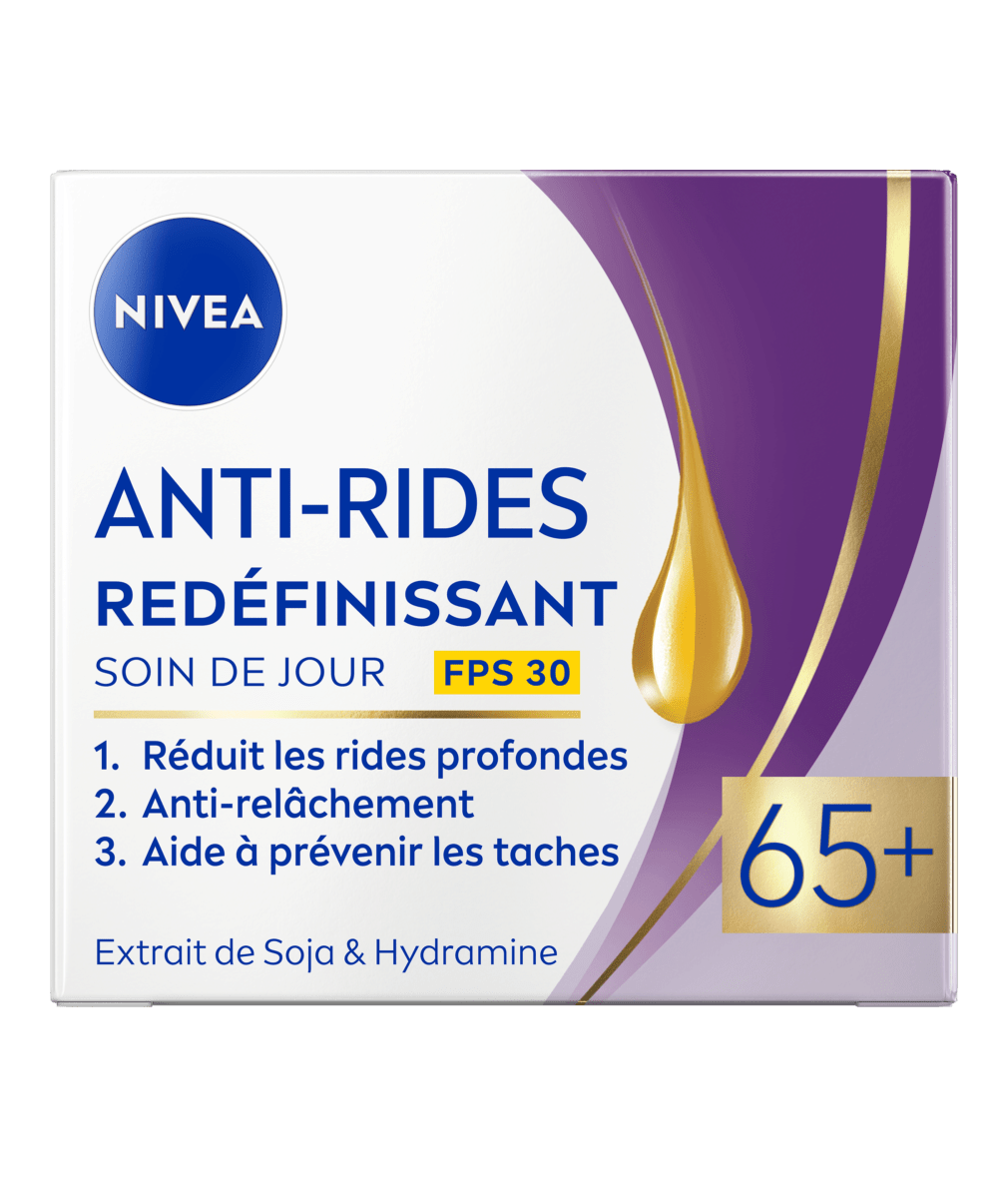 Le Soin de Jour Anti-Rides 65+ NIVEA avec extrait de soj et hydramine redéfinit les contours du visage à la peau mature exigeante et combat les rides profondes.