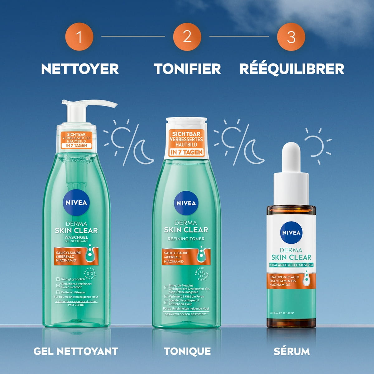 Le Tonique Derma Skin Clear NIVEA avec de l'acide salicylique, du sel marin et du niacinamide restaure l’équilibre de la peau sujette aux impuretés.