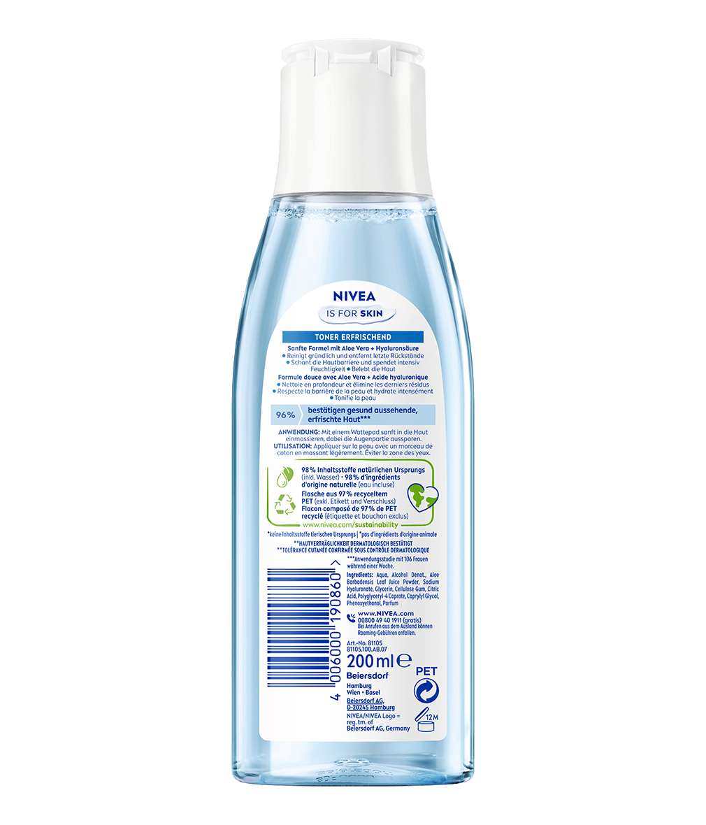 Le Tonique Rafraîchissant NIVEA a été spécialement conçu pour purifier les peaux normales et mixtes. La formule avec de l'Aloe Vera et de l'acide hyaluronique hydrate intensément la peau, la tonifie et la rafraîchit. Le Tonique Rafraîchissant NIVEA élimine également tout en douceur les derniers résidus laissés par le nettoyage. Sa tolérance cutanée est confirmée sous contrôle dermatologique.