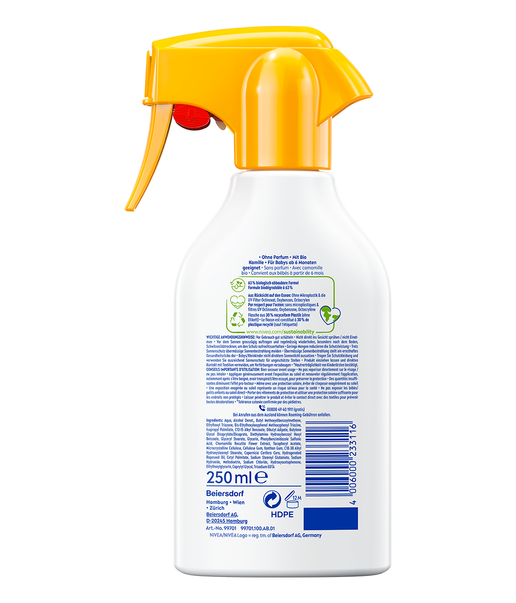Le Trigger Babies & Kids sensitive protect avec FPS 50+ NIVEA SUN offre une protection UVA/UVB immédiate et haute performance à la peau vulnérable des bébés et des enfants.